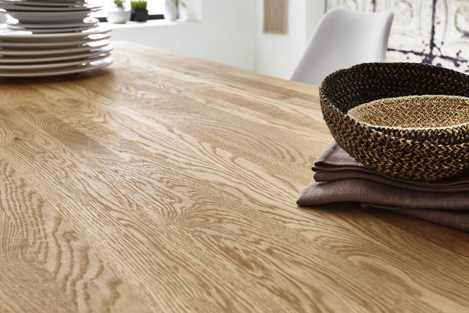 • Die 200 x 100 cm große Tischplatte mit 35 mm Kanten-Optik ist aus massiver Eiche hergestellt und bietet Platz für die ganze Familie.