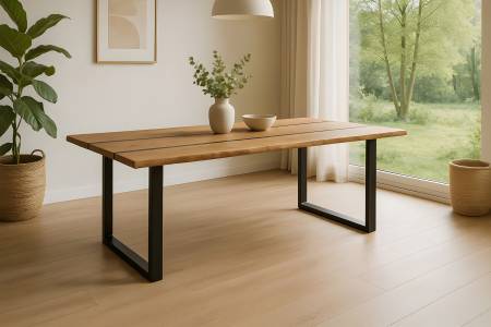 Die Kombination unserer metallenen Tischgestelle mit der massiven, naturbelassenen Holzplatte ergibt die perfekte Symbiose aus Natürlichkeit und modernem Touch.