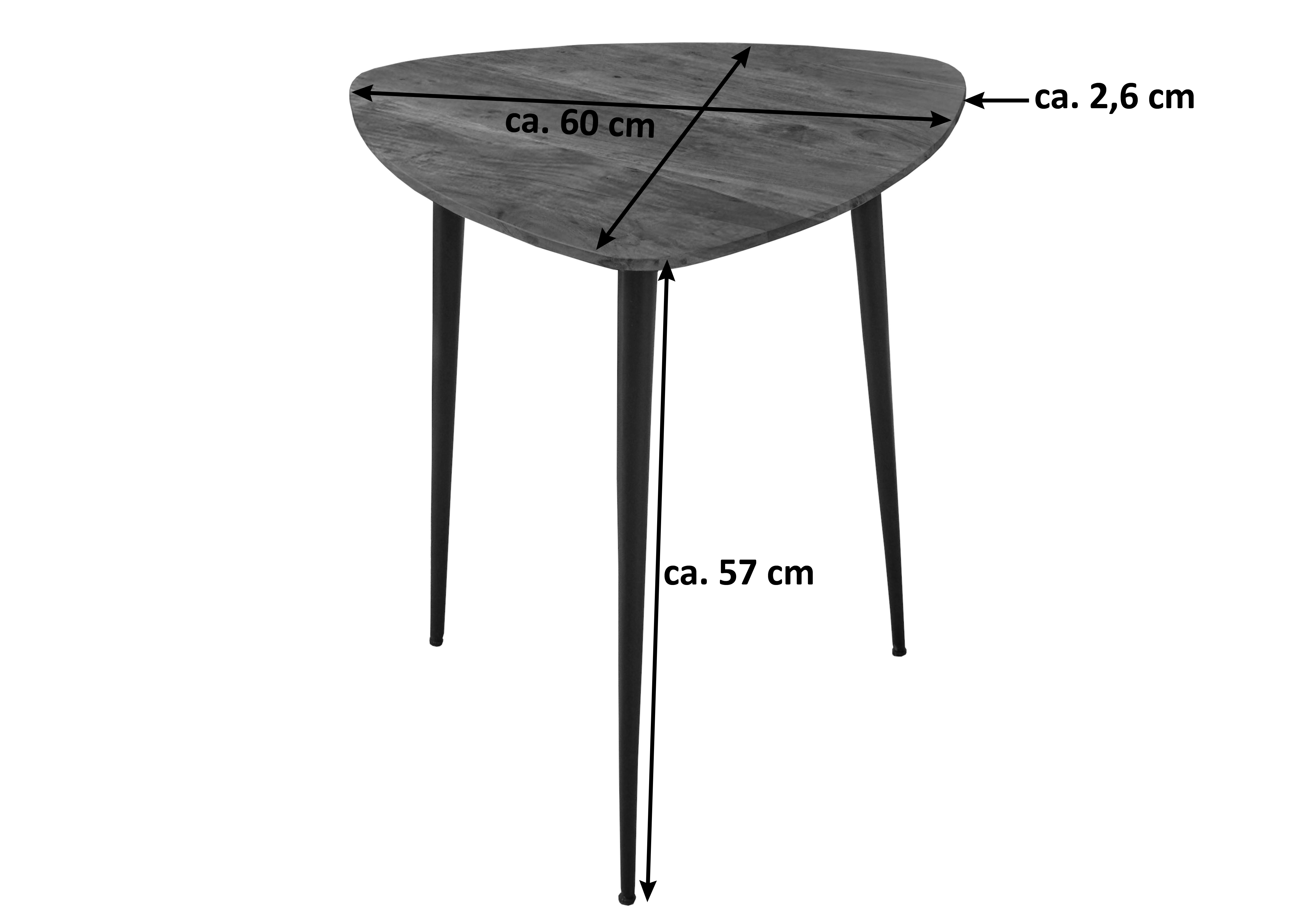 - Breite: ca. 60 cm | Tiefe: ca. 60 cm | Höhe: ca. 57 cm | Dicke der Tischplatte: ca. 25 bis 30 mm | Durchmesser der Tischbeine: ca. 30mm (oben) & 15mm (unten)