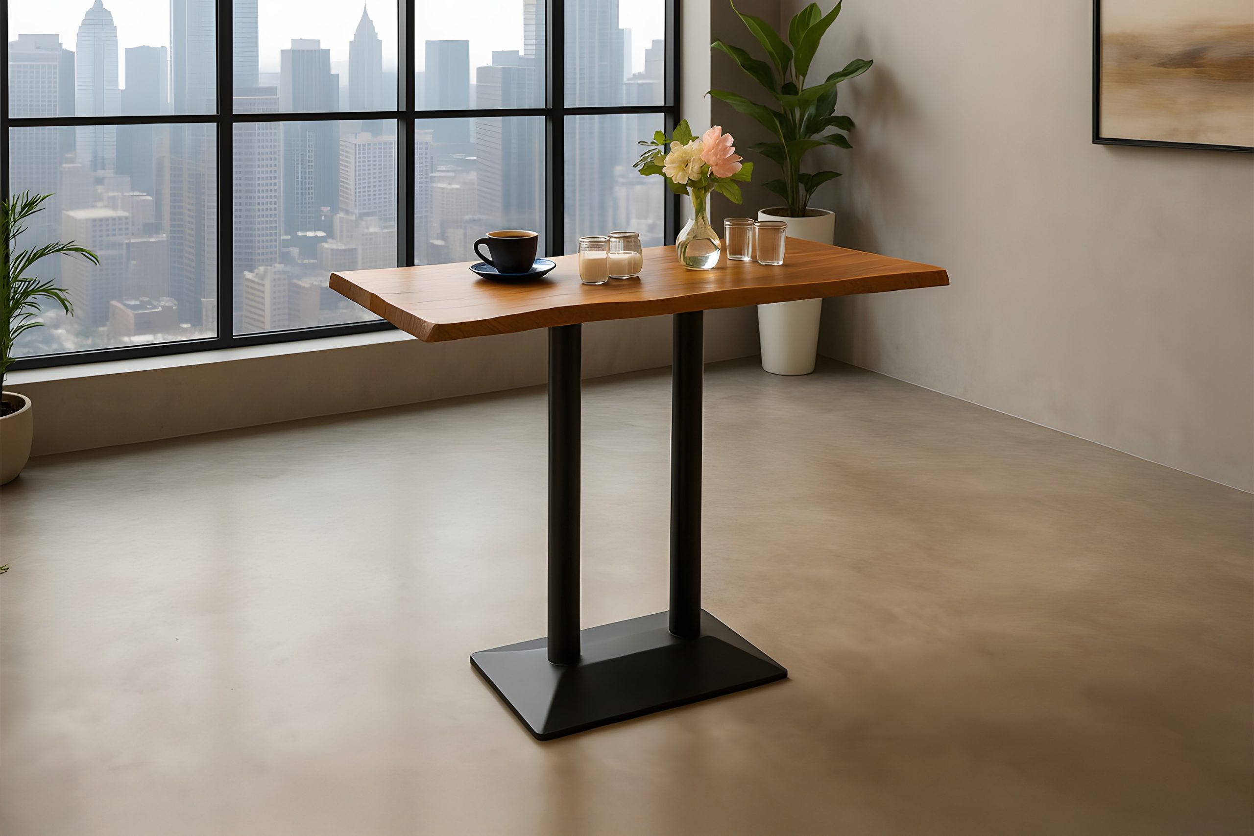 Das moderne Doppel-Säulengestell aus schwarz lackiertem Metall sorgt für hohe Standfestigkeit und verleiht dem Tisch seinen minimalistischen Industrial-Charakter. Ob als Stehtisch für die Küche, als kompakter Esstisch für zwei Personen oder als stylisher Bistrotisch im Wohnbereich – Ian macht überall eine gute Figur.