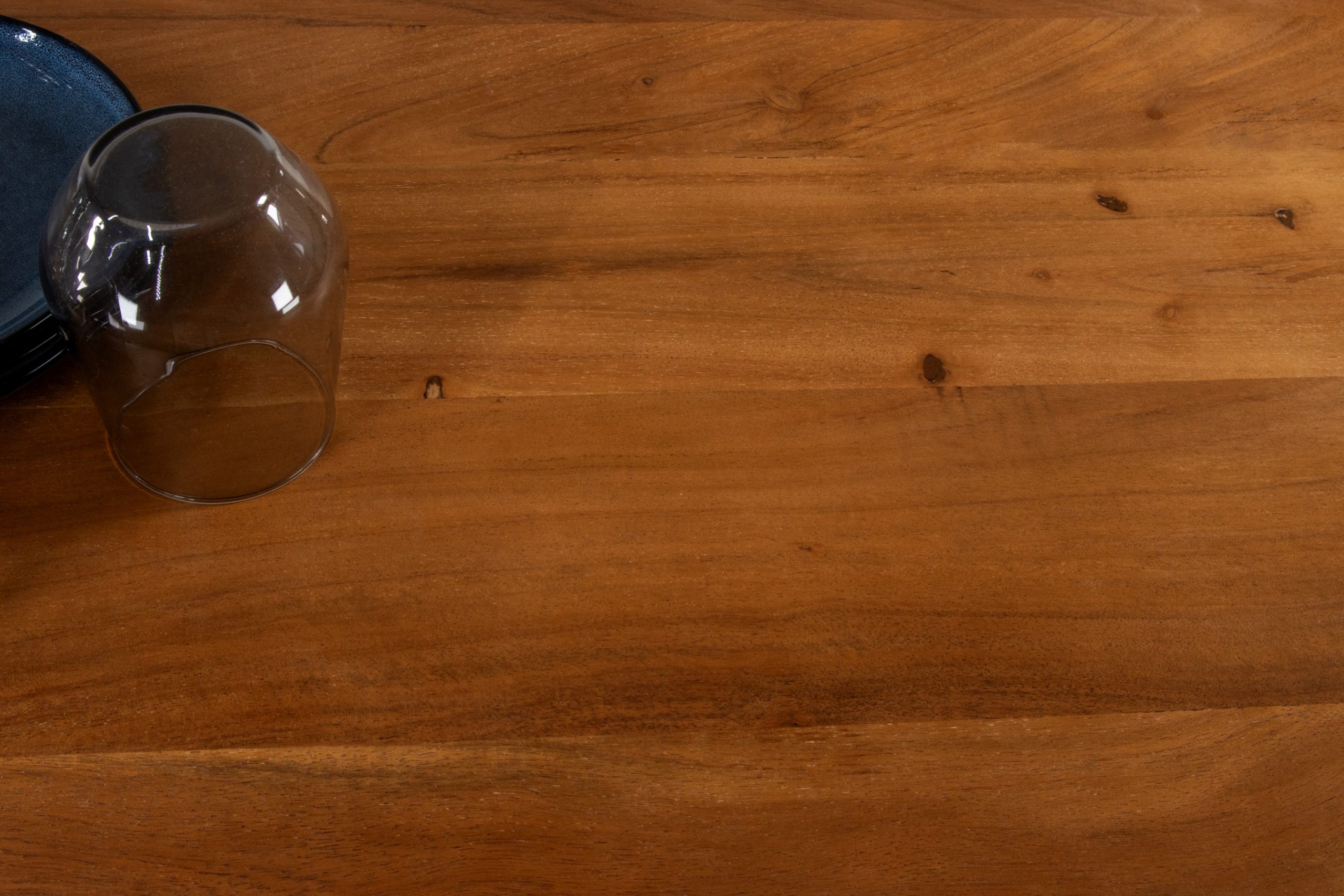 Die robuste Holzplatte ist 26 mm stark und wurde nussbaumfarben lackiert. So bleibt die warme Farbgebung des Akazienholzes erhalten und die Oberfläche ist gleichzeitig optimal vor Feuchtigkeit und Gebrauchsspuren geschützt.