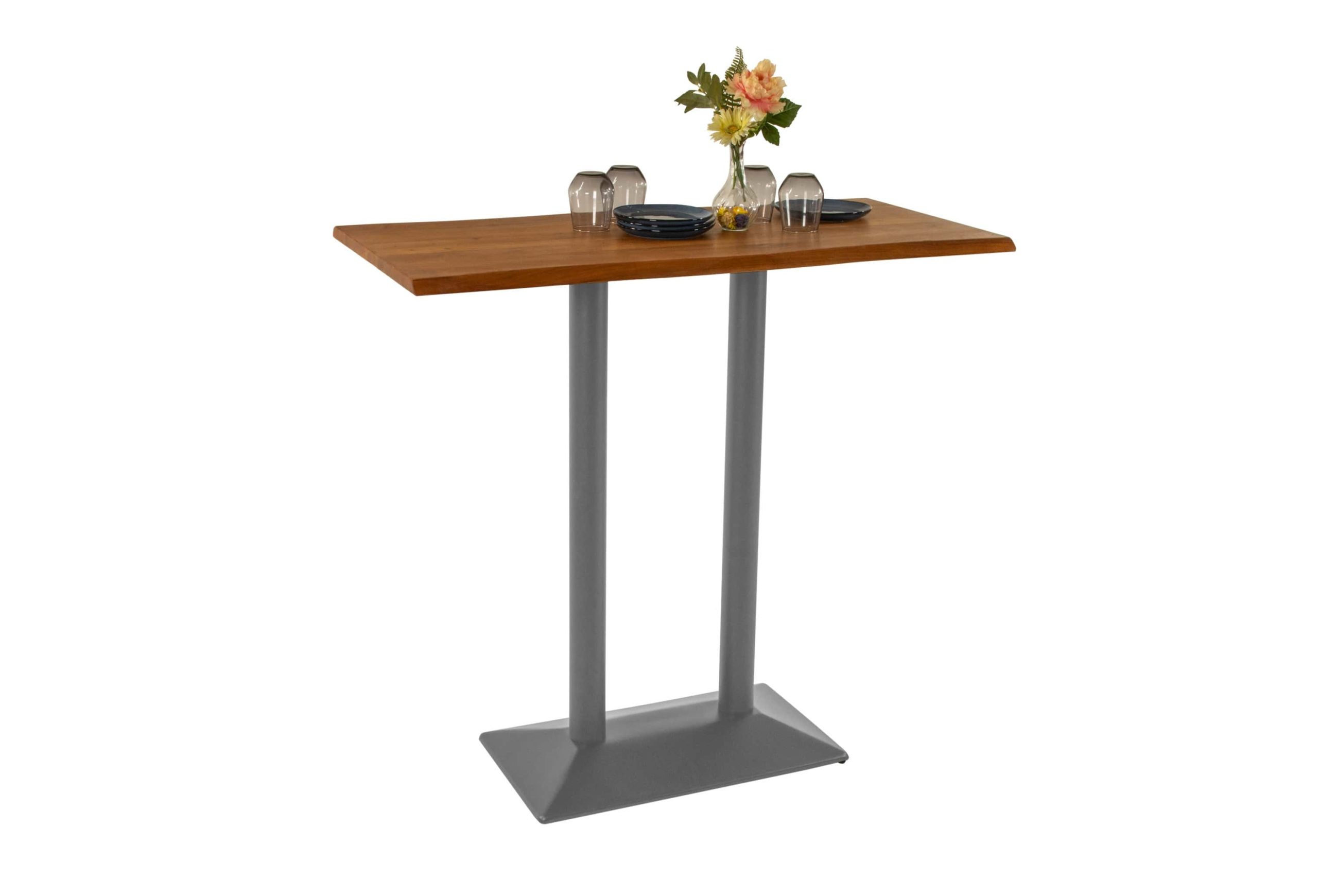 Bistrotisch Ian | 120 x 70 cm | Akazienholz massiv + nussbaumfarben | Doppel-Säulengestell Silber | Echte Baumkante
