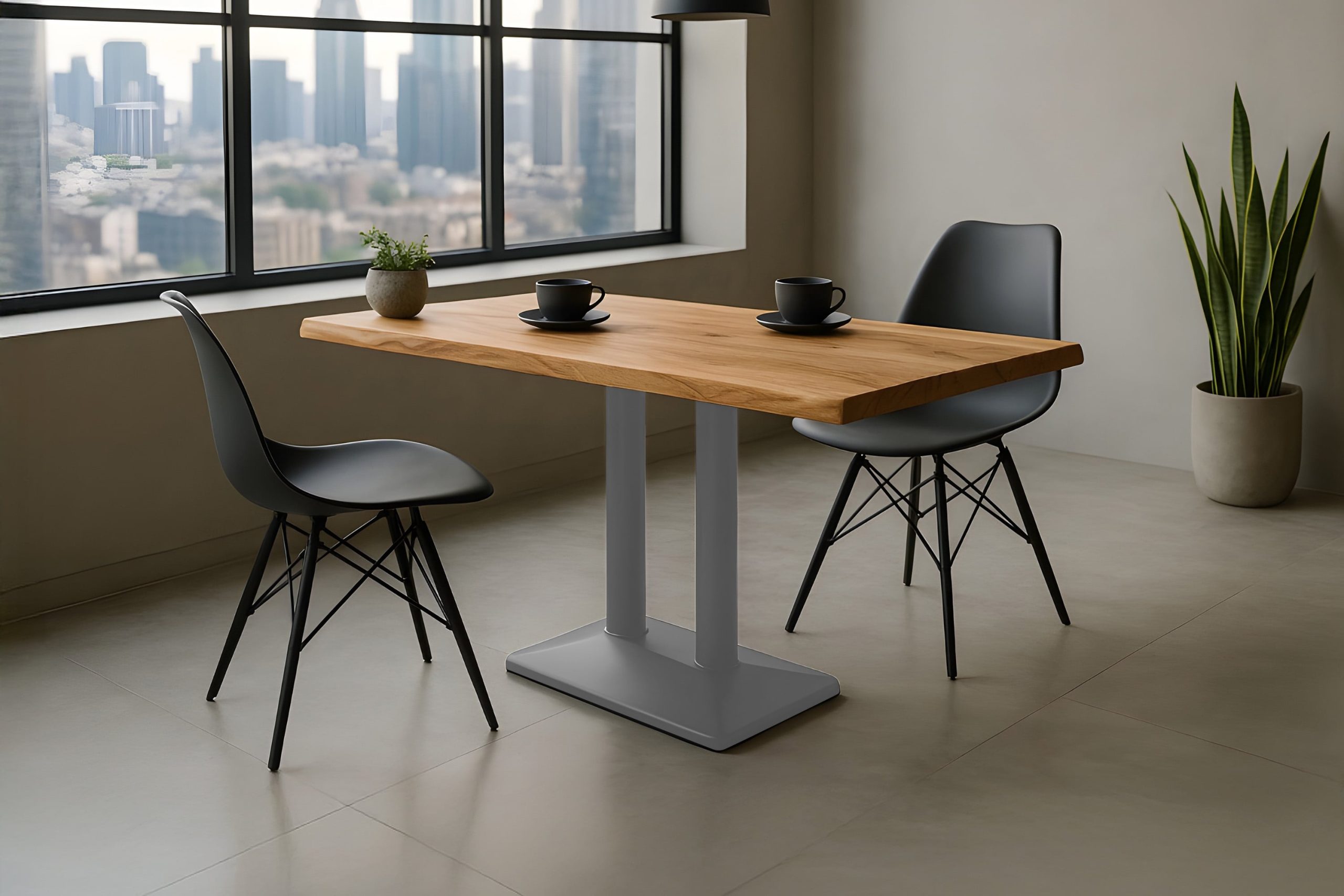 Das säulenförmige Tischgestell aus silbernem Eisen sorgt für maximale Beinfreiheit und hohe Stabilität. Durch seine elegante Form wirkt Isla leicht und modern, ideal für Zuhause, Gastronomie, Messen oder Bars. Das Zusammenspiel aus warmer Holzoptik und kühlem Metall schafft einen reizvollen Kontrast im industriellen Stil.