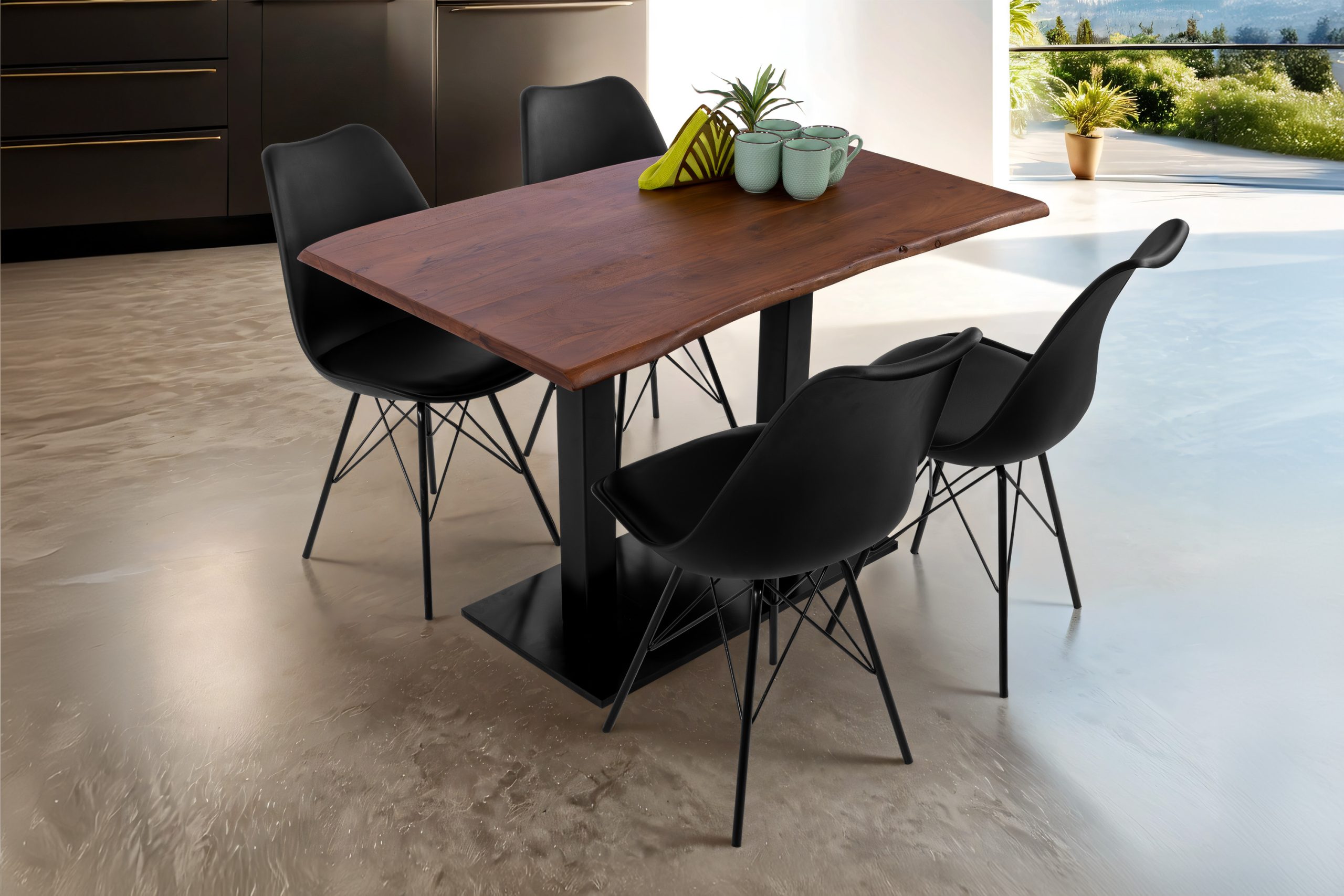 Der Bistrotisch Islas vereint Natürlichkeit und modernes Design zu einem stilvollen Blickfang. Die 26 mm starke Tischplatte aus massivem Akazienholz wird direkt aus dem Baumstamm gefertigt und behält ihre ursprüngliche Form – so entsteht ein echtes Stück Natur mit unverwechselbarem Charakter.