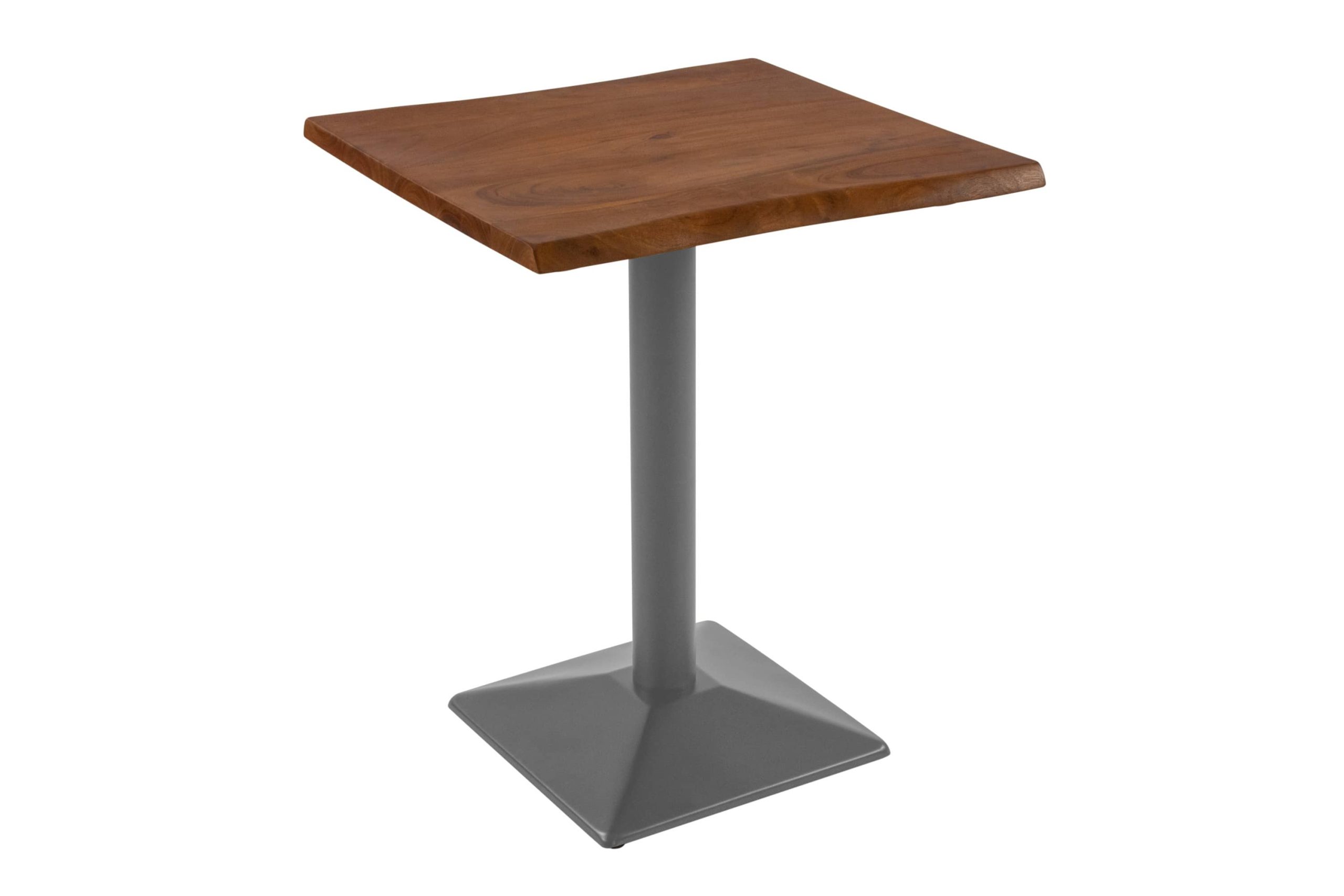 Trendiger Bistrotisch Iris, Akazienholz massiv & nussbaumfarben, echte Baumkante, mit silbernem Säulenfuß, 60×60 cm