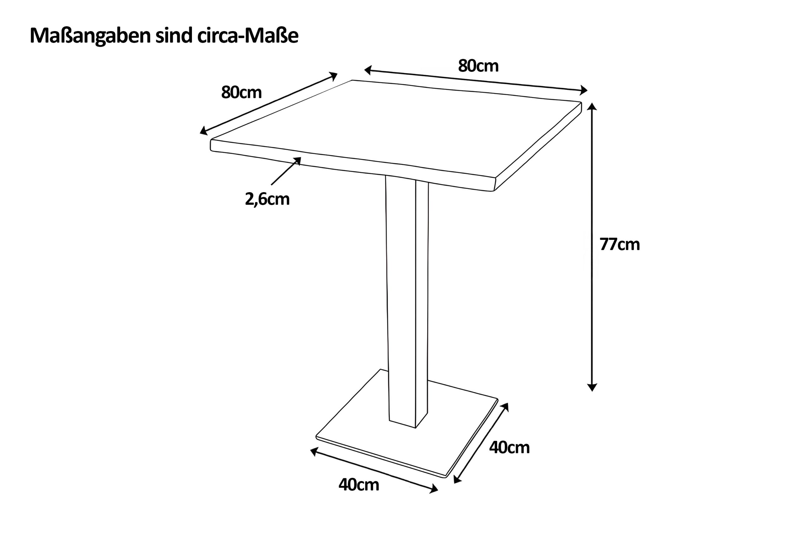 - Der 80×80 cm große Säulentisch besitzt eine 26 mm starke Tischplatte aus Massivholz.