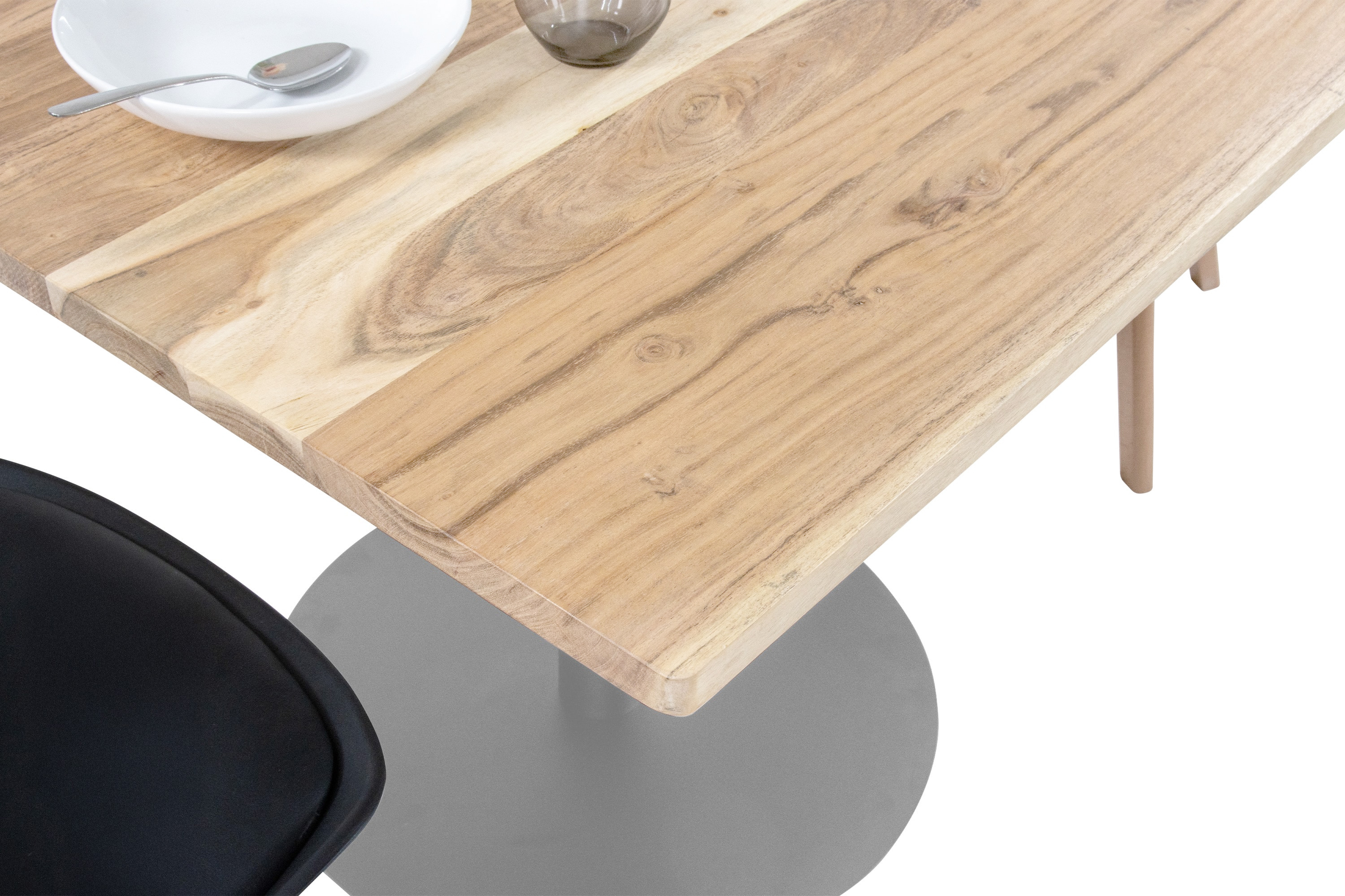 Der Säulentisch Emile kombiniert massives Echtholz mit einem stabilen Metallgestell und bietet Ihnen damit Qualität und Stil zu einem fairen Preis. Die Tischplatte aus massivem Akazienholz begeistert durch ihre naturbelassene Maserung, die jedem Tisch seinen individuellen Charakter verleiht. Dank der Lackierung bleibt die Oberfläche langlebig, pflegeleicht und geschützt vor Gebrauchsspuren.