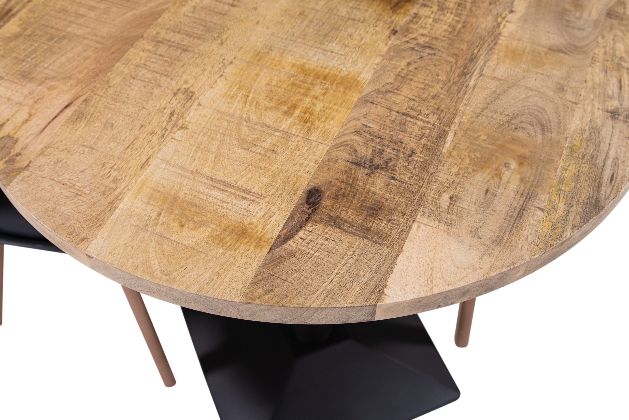 Der kleine Esstisch Emilio verbindet massives Mangoholz im rough Look mit moderner Eleganz. Die runde Platte wirkt durch ihre raue, lebendige Oberfläche besonders ausdrucksstark und macht jedes Exemplar zu einem Einzelstück mit Charakter. Die Lackierung schützt das Holz zuverlässig vor Abnutzung und erleichtert die Pflege.