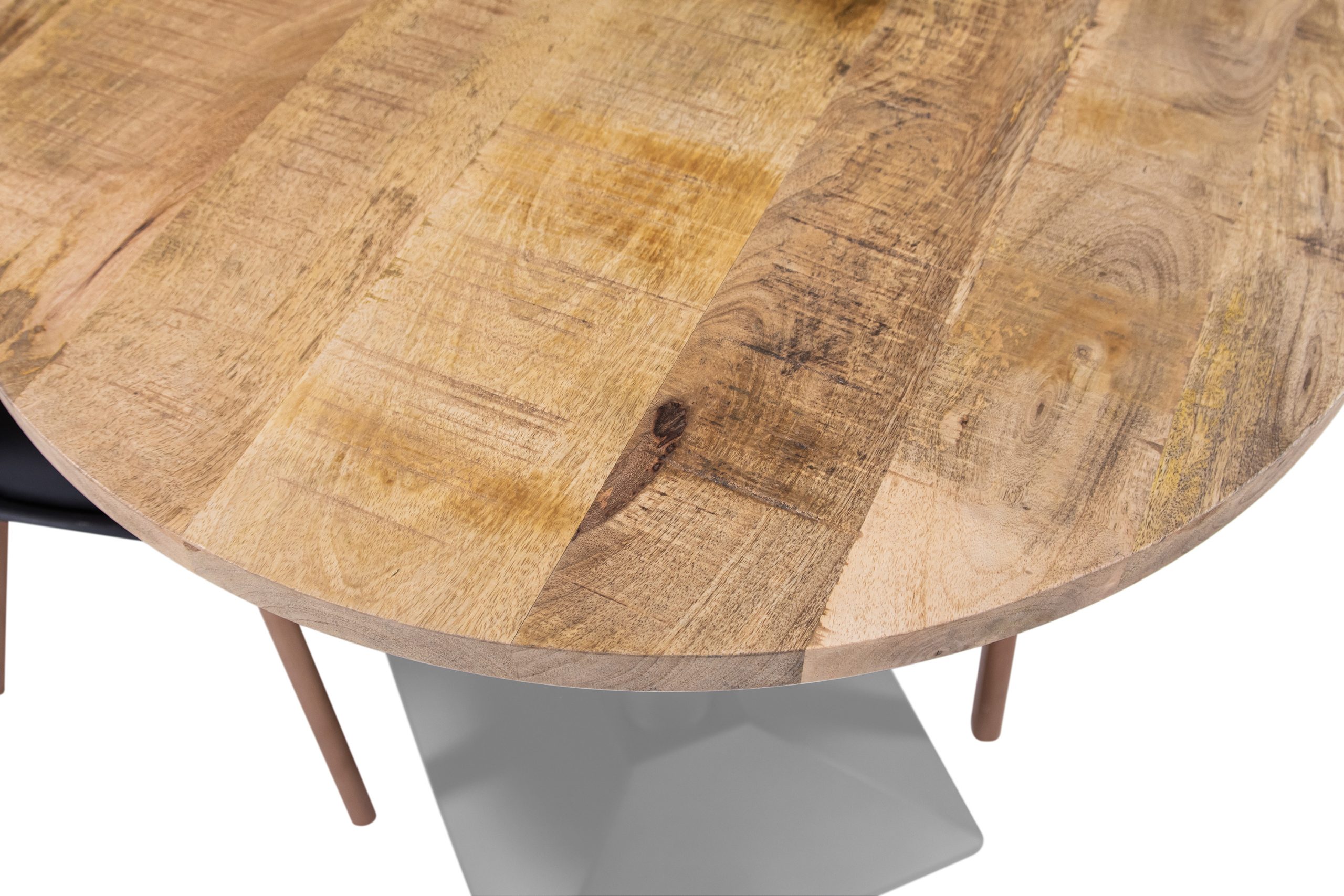 Der kleine Esstisch Emilio verbindet massives Mangoholz im rough Look mit moderner Eleganz. Die runde Platte wirkt durch ihre raue, lebendige Oberfläche besonders ausdrucksstark und macht jedes Exemplar zu einem Einzelstück mit Charakter. Die Lackierung schützt das Holz zuverlässig vor Abnutzung und erleichtert die Pflege.