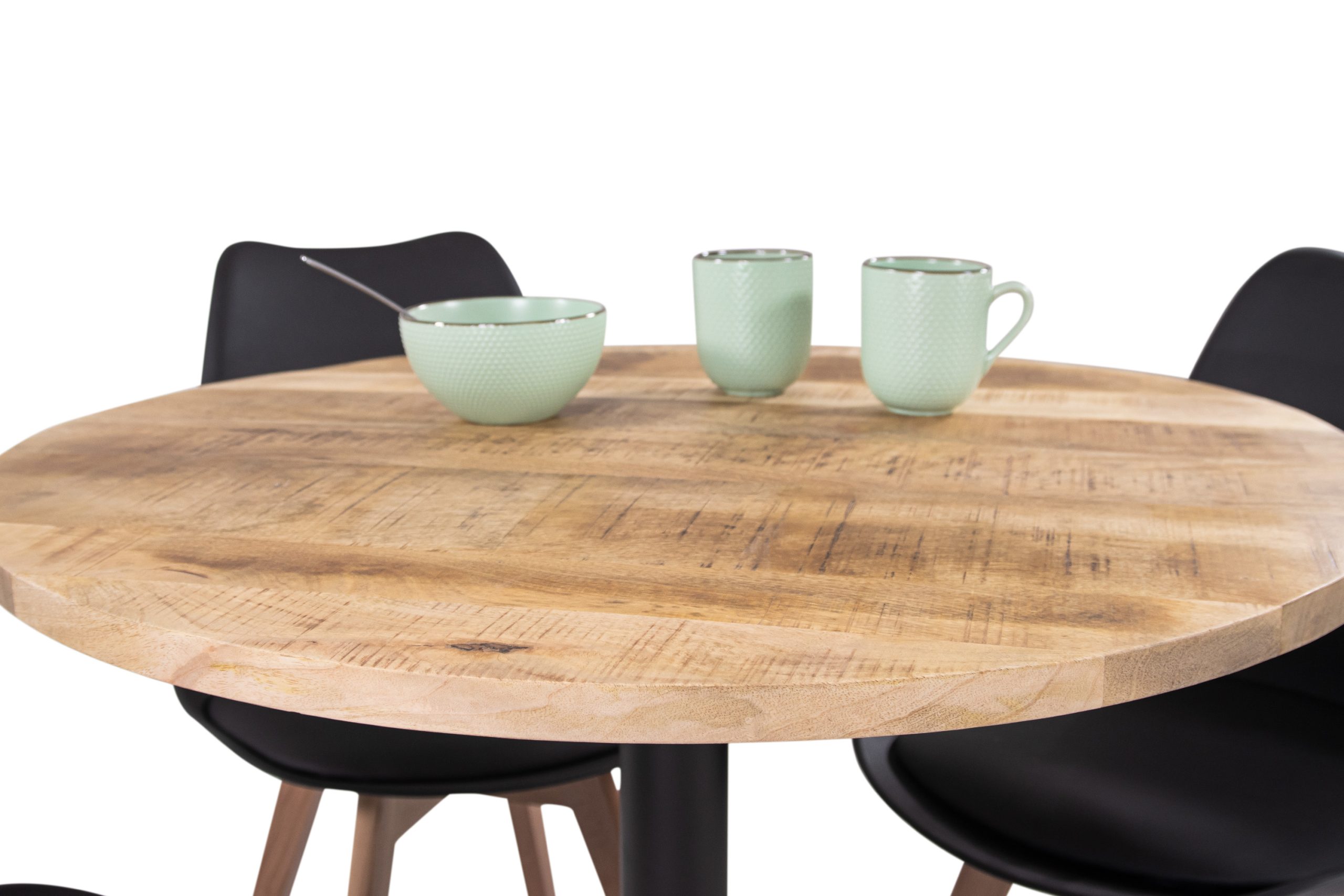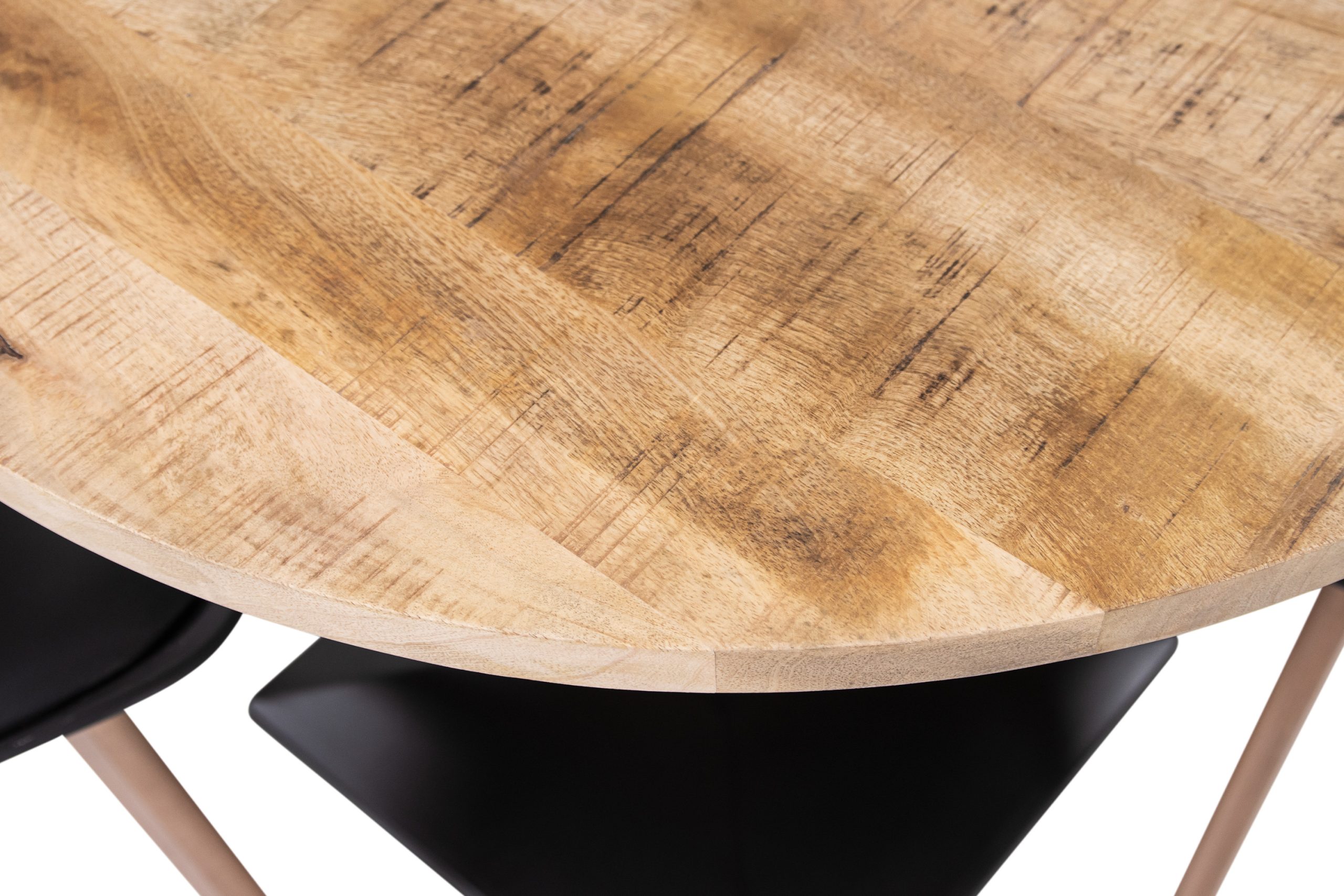 Der kleine Esstisch Emilio verbindet massives Mangoholz im rough Look mit moderner Eleganz. Die runde Platte wirkt durch ihre raue, lebendige Oberfläche besonders ausdrucksstark und macht jedes Exemplar zu einem Einzelstück mit Charakter. Die Lackierung schützt das Holz zuverlässig vor Abnutzung und erleichtert die Pflege.