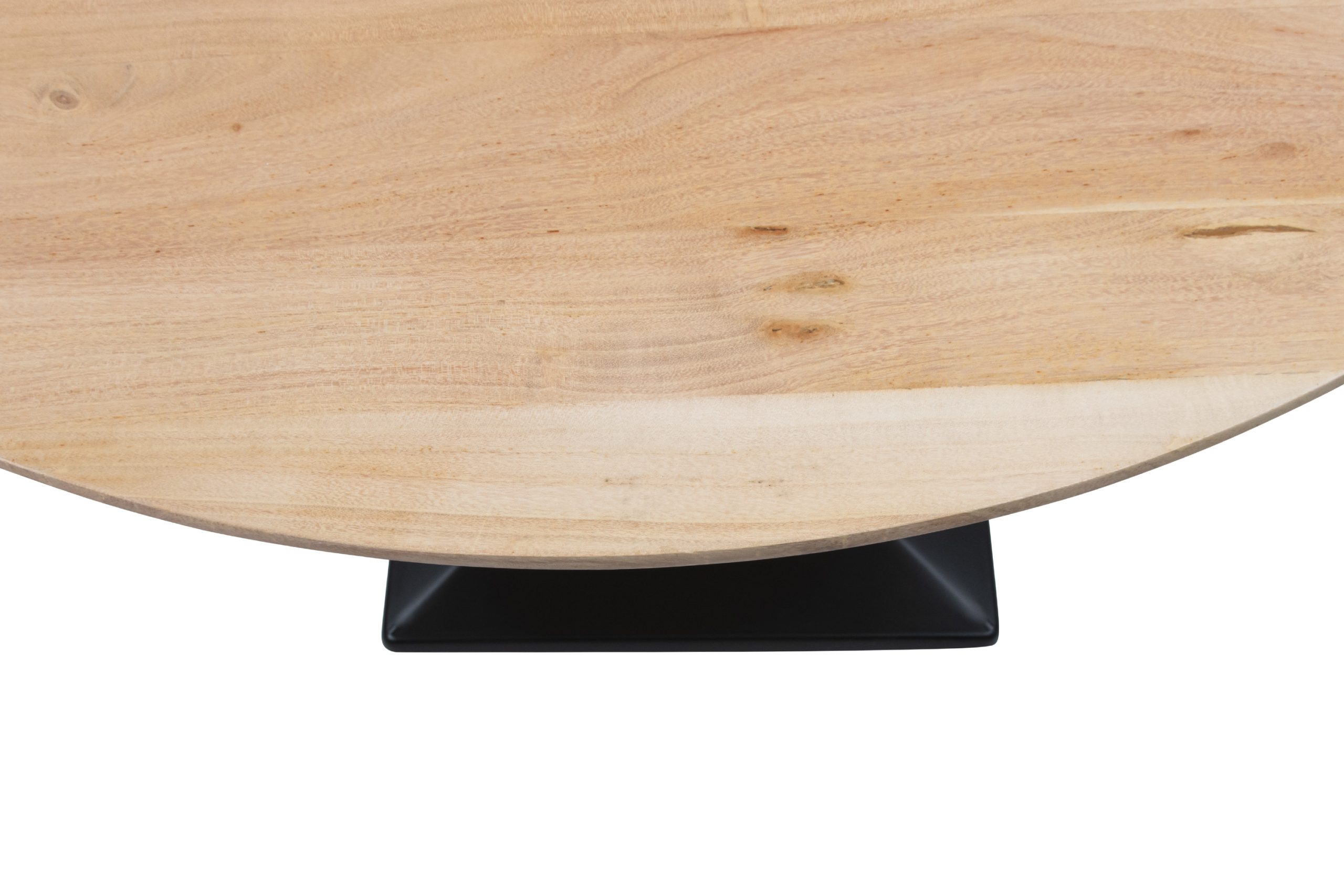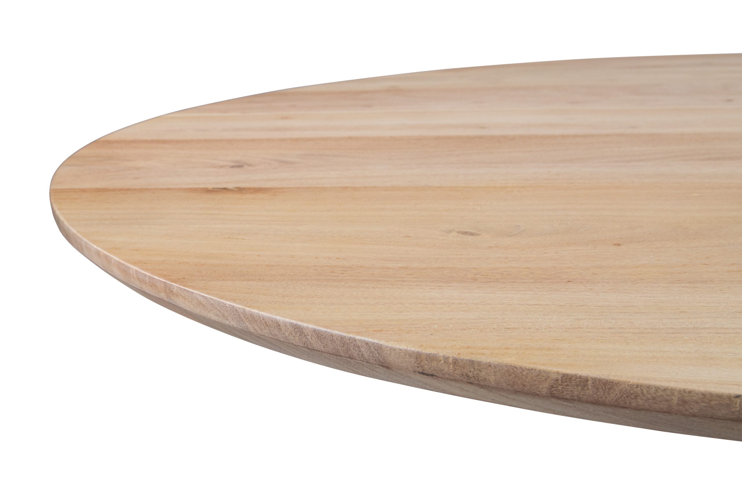 Die Oberfläche ist naturbaumfarben lackiert – ein edler Ton, der Wärme ausstrahlt und die Pflege erleichtert. Der stilvoll abgeschrägte Schweizer Kantenverlauf verleiht der runden Platte eine leichte, fast schwebende Optik.