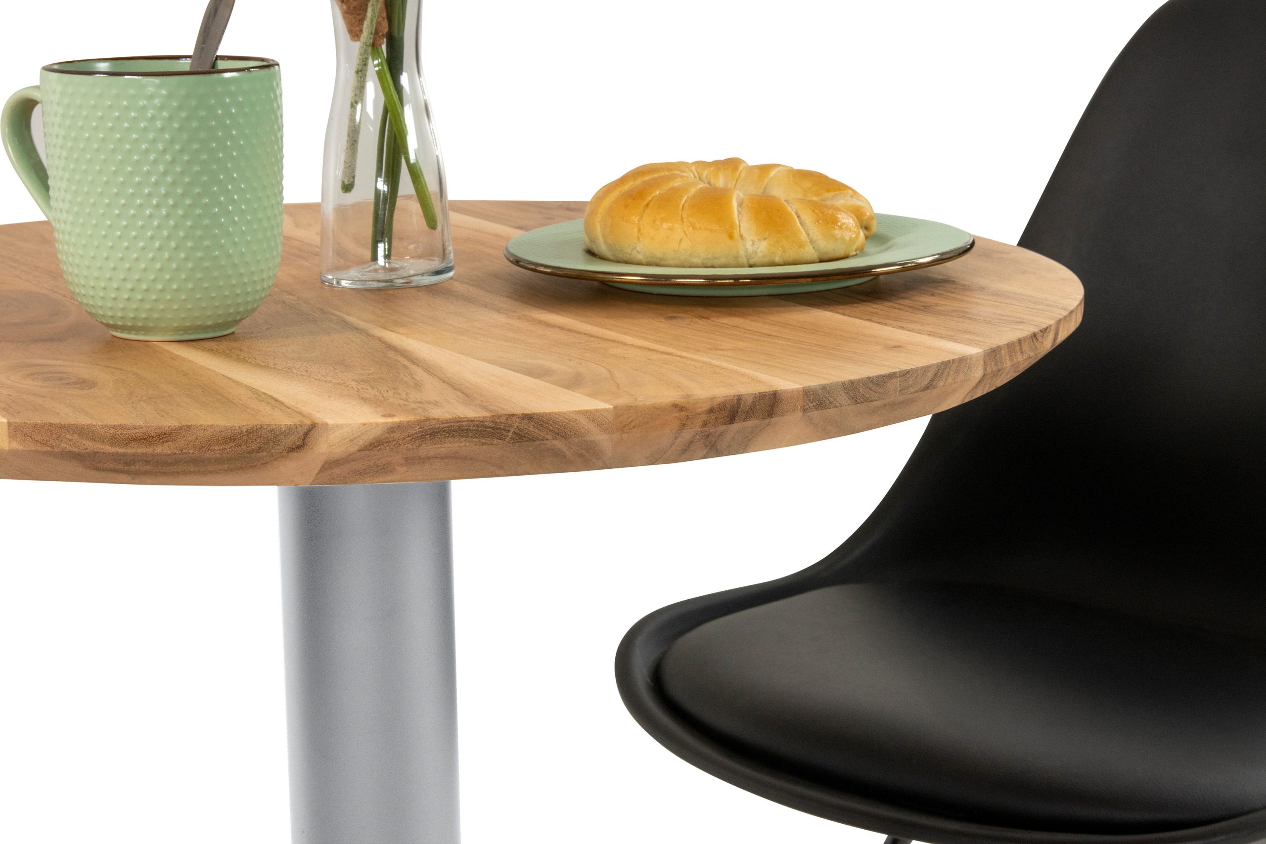 Bistrotisch Brasilian | 70 x 70 cm | Akazienholz massiv + naturfarben | Runde Platte mit Schweizer Kante | Silbernes Gestell aus Metall