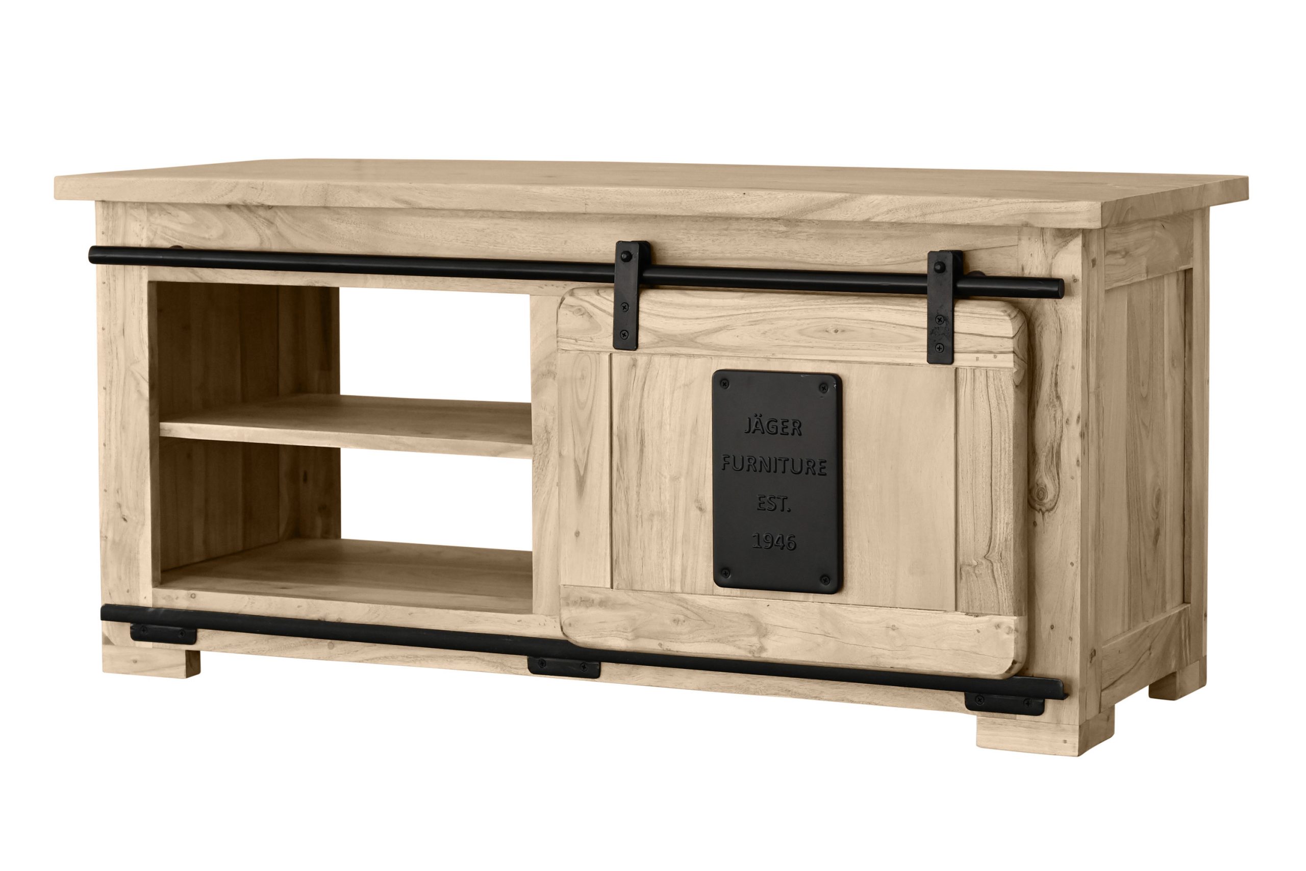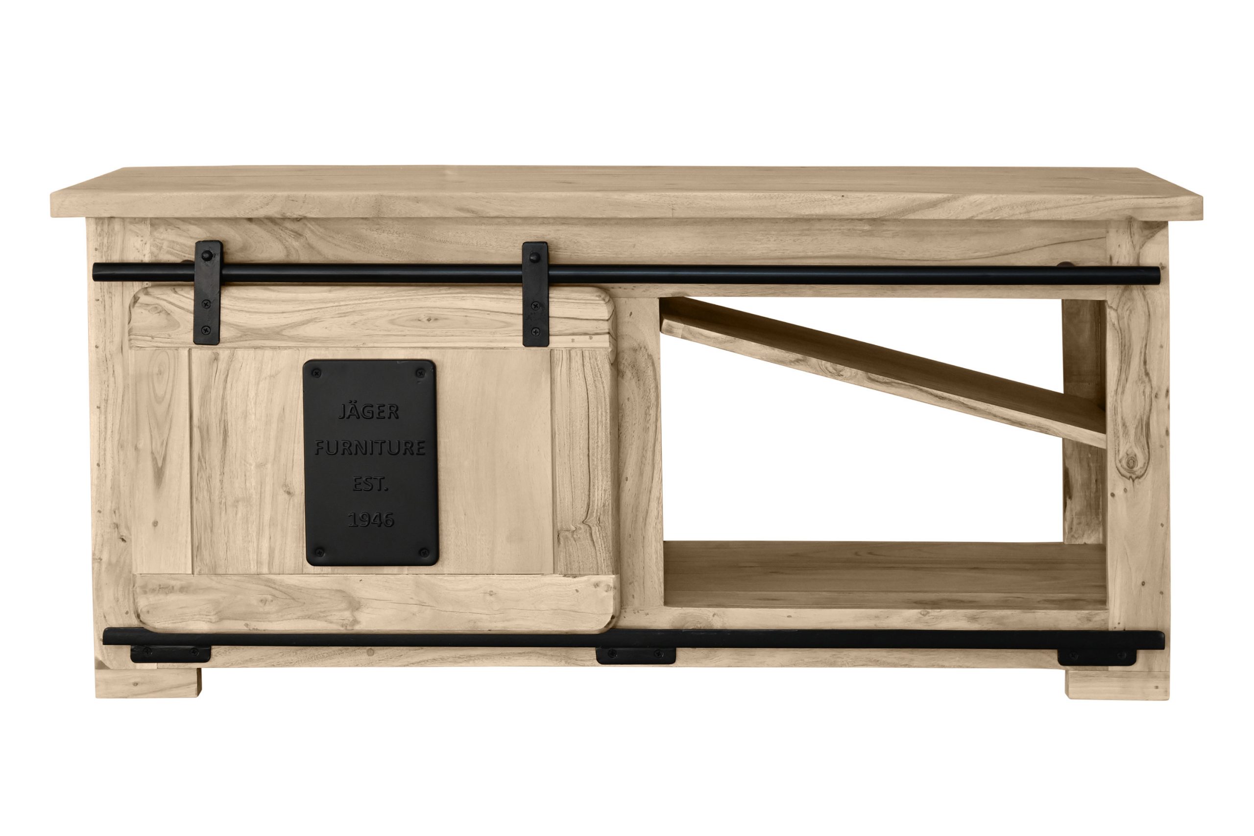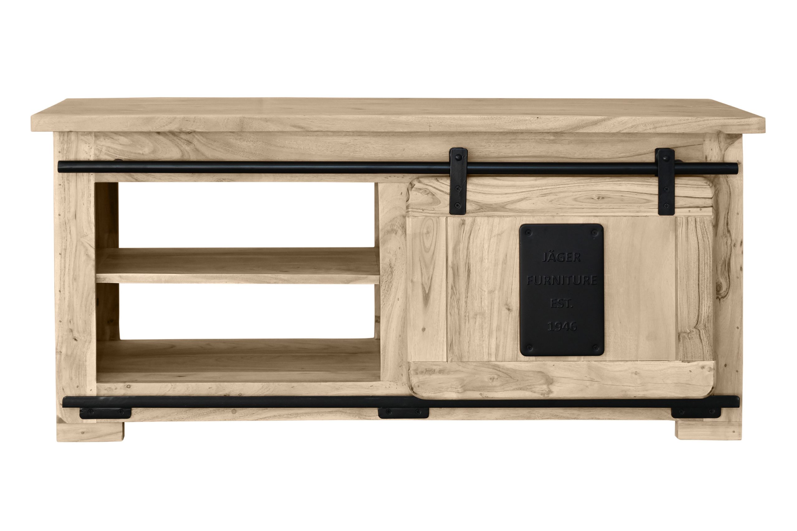 Die Holzschiebetür gleitet sanft auf einer Eisen-Reling mit robusten Metallrollen und ermöglicht flexiblen Zugriff. Drei offene Fächer unter der Tischplatte schaffen zusätzlichen Stauraum für Zeitschriften, Fernbedienungen oder Accessoires. Die großzügige Tischplatte lädt ein, sie dekorativ zu gestalten oder gesellige Abende zu genießen. Stilvolle Gusseisen-Elemente unterstreichen den Industrial- und Used-Look und machen Libro zu einem echten Blickfang im Wohnzimmer.