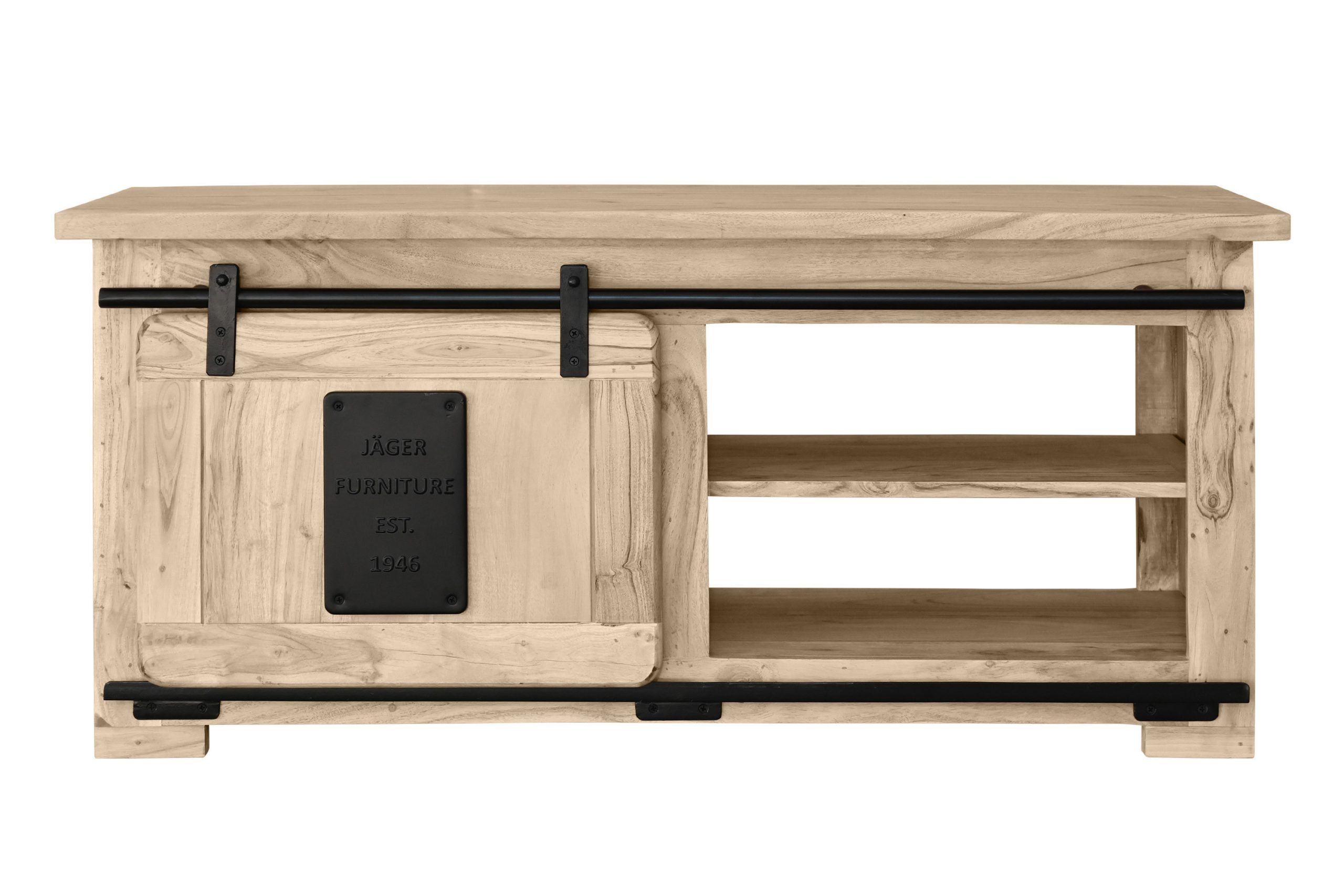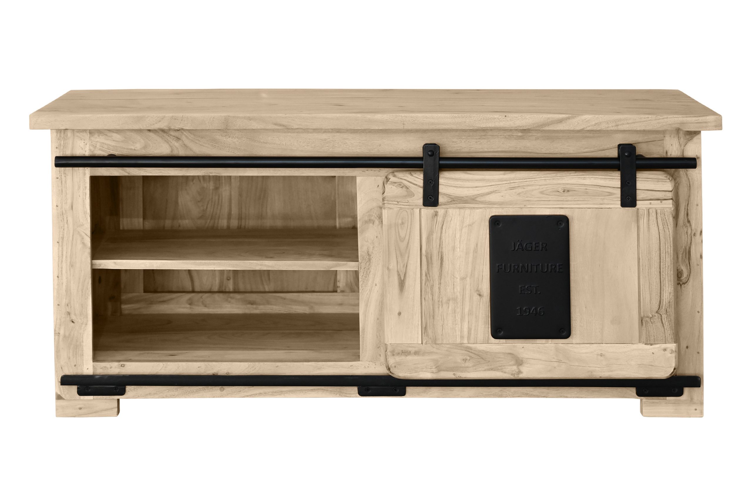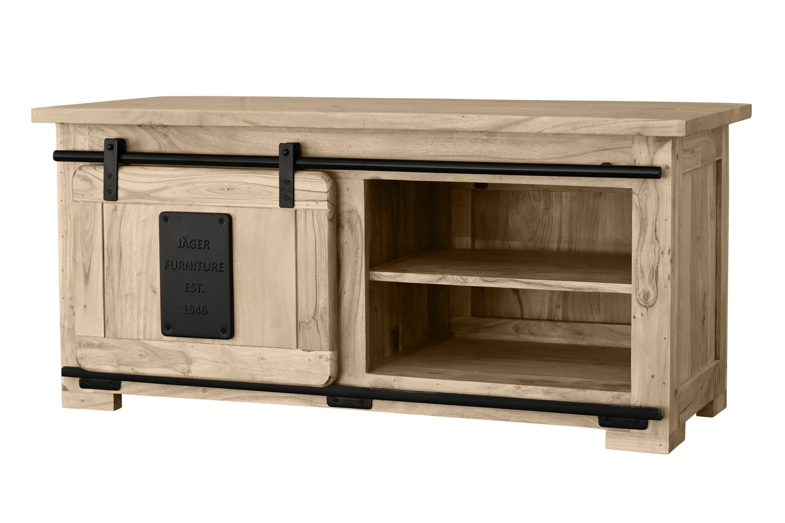 Die Holzschiebetür gleitet sanft auf einer Eisen-Reling mit robusten Metallrollen und ermöglicht flexiblen Zugriff. Drei offene Fächer unter der Tischplatte schaffen zusätzlichen Stauraum für Zeitschriften, Fernbedienungen oder Accessoires. Die großzügige Tischplatte lädt ein, sie dekorativ zu gestalten oder gesellige Abende zu genießen. Stilvolle Gusseisen-Elemente unterstreichen den Industrial- und Used-Look und machen Libro zu einem echten Blickfang im Wohnzimmer.