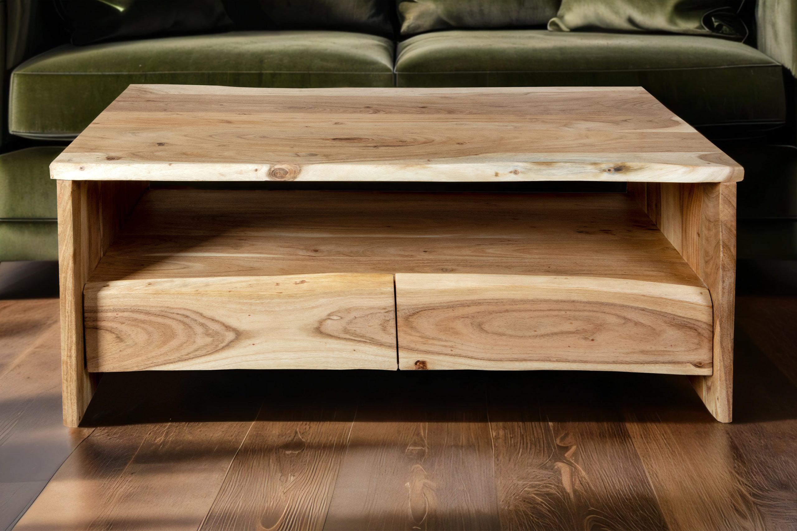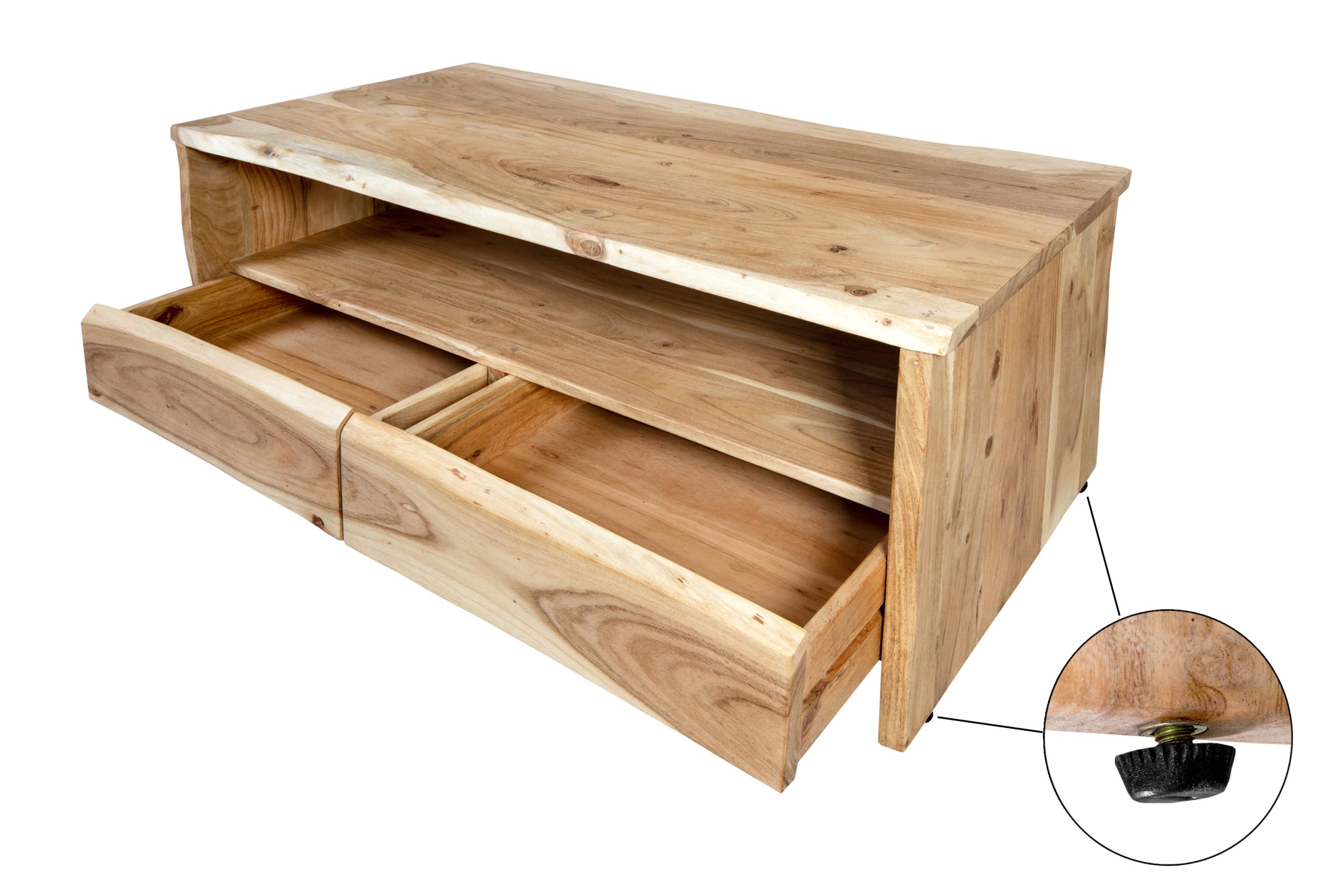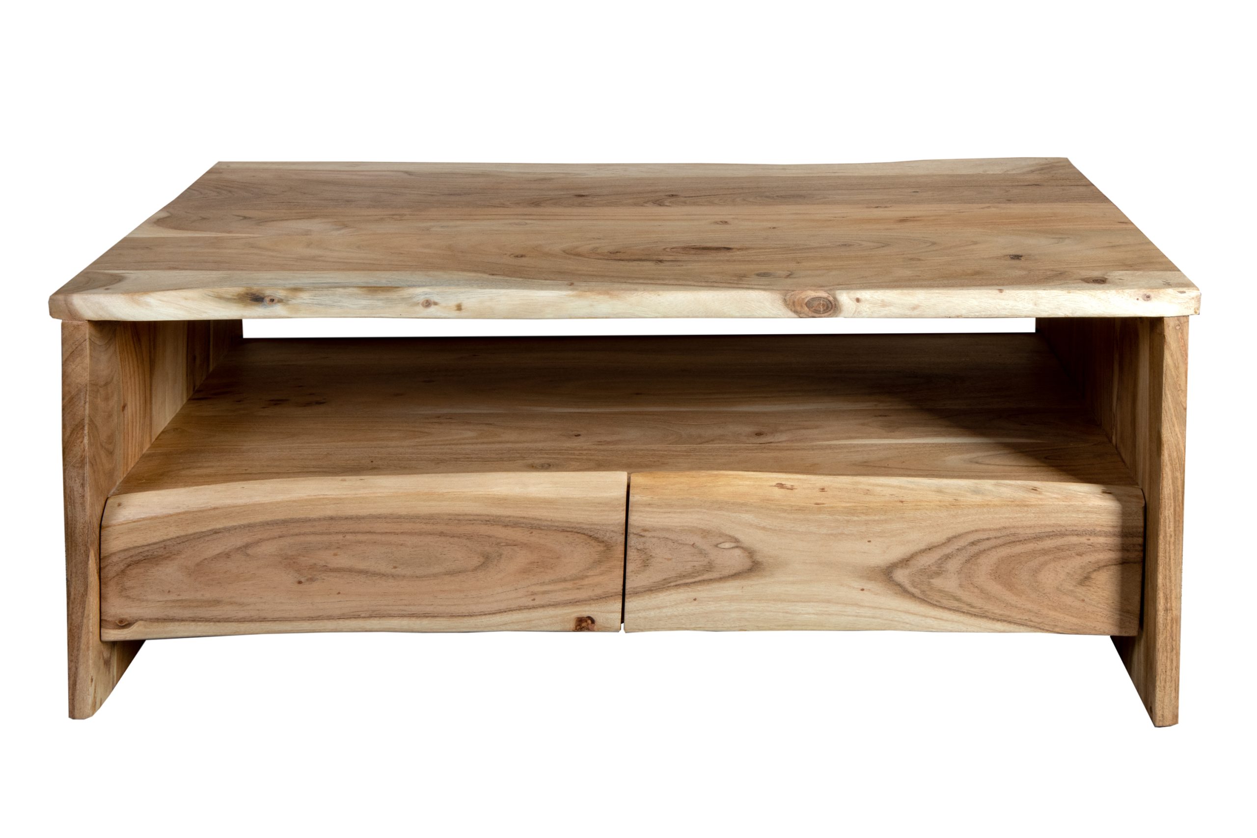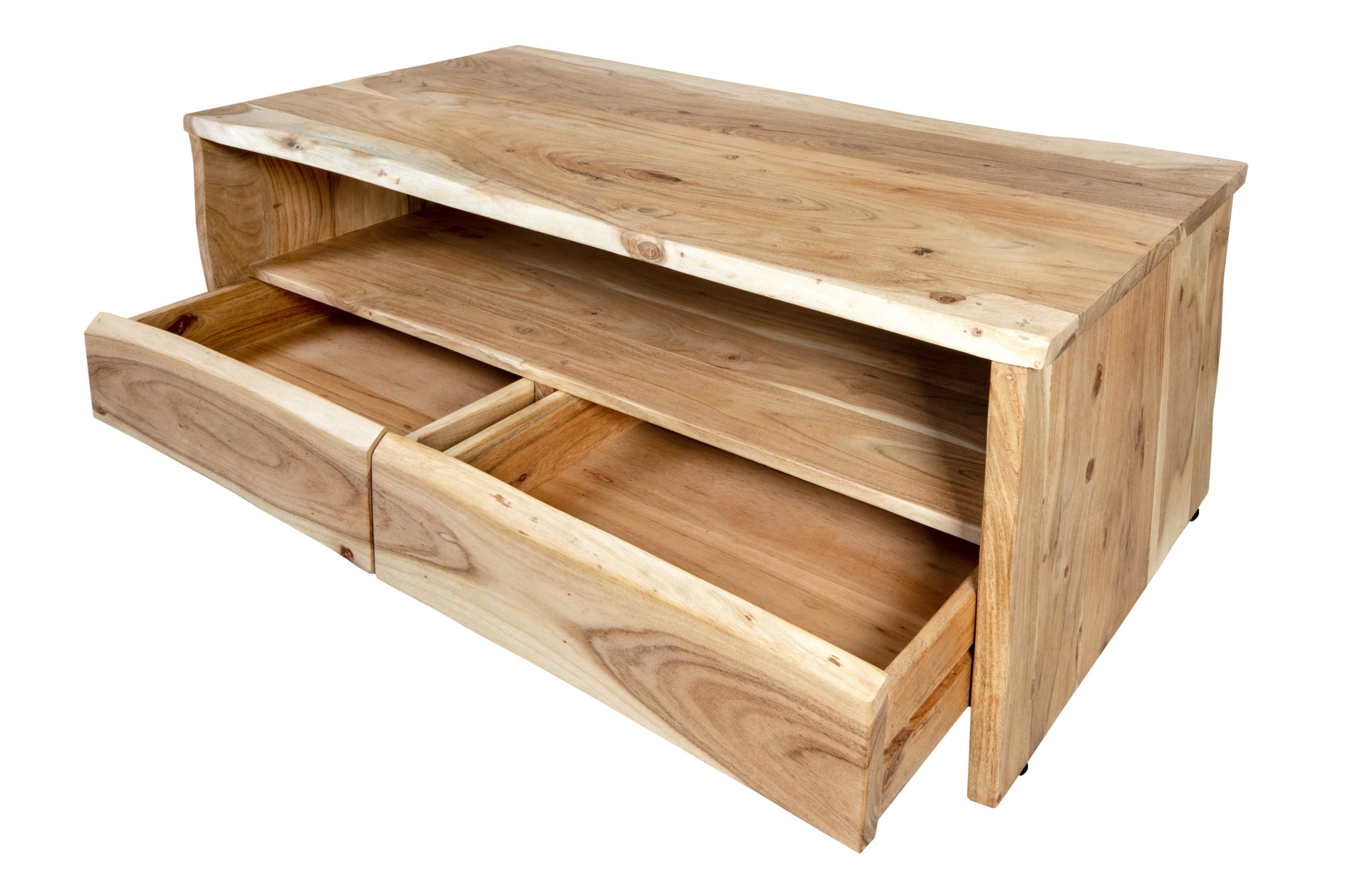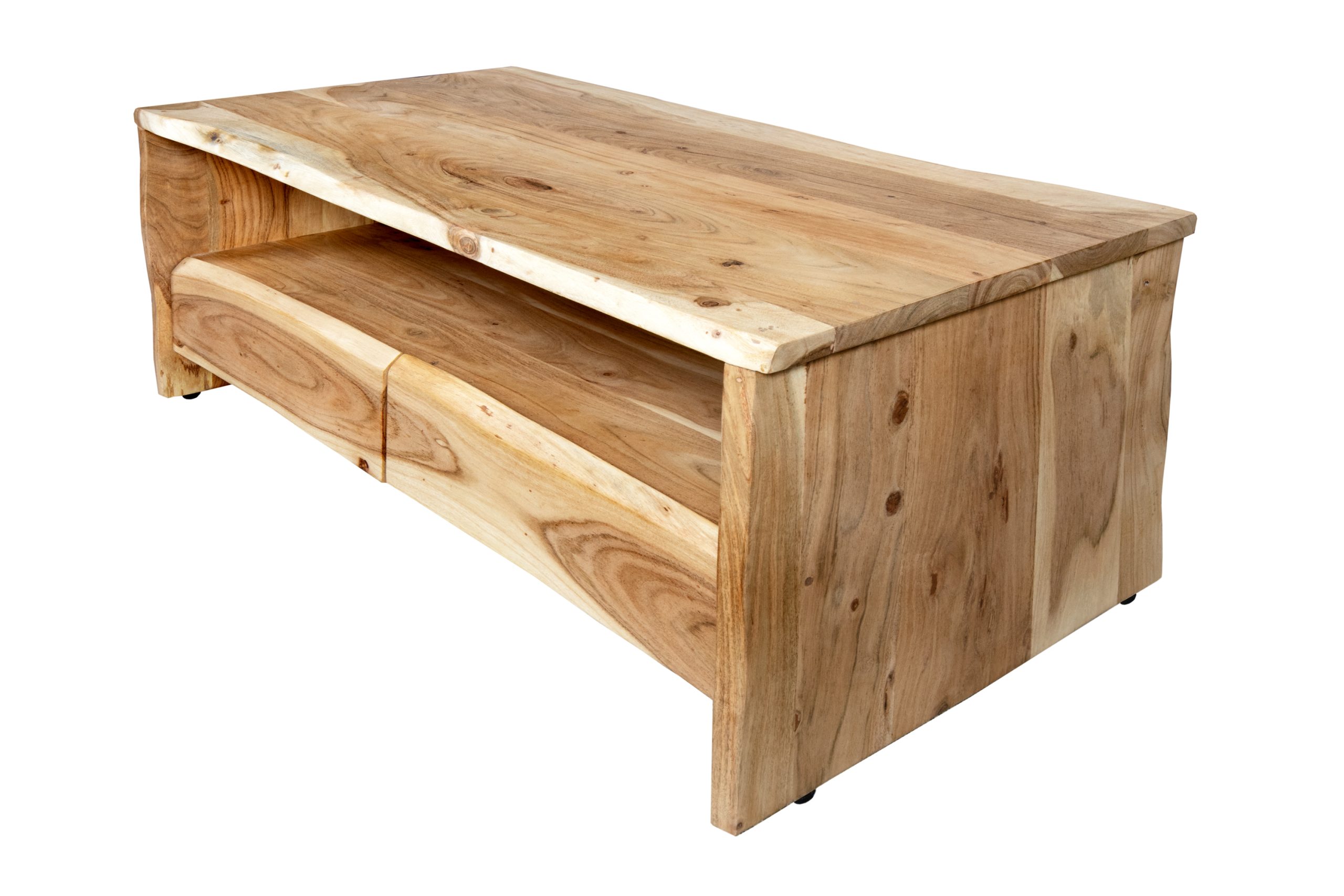 Praktischer Couchtisch Dahlia III mit Ablage & 2 Schubladen, 110x60x45 cm, Akazienholz massiv + naturfarben, echte Baumkante