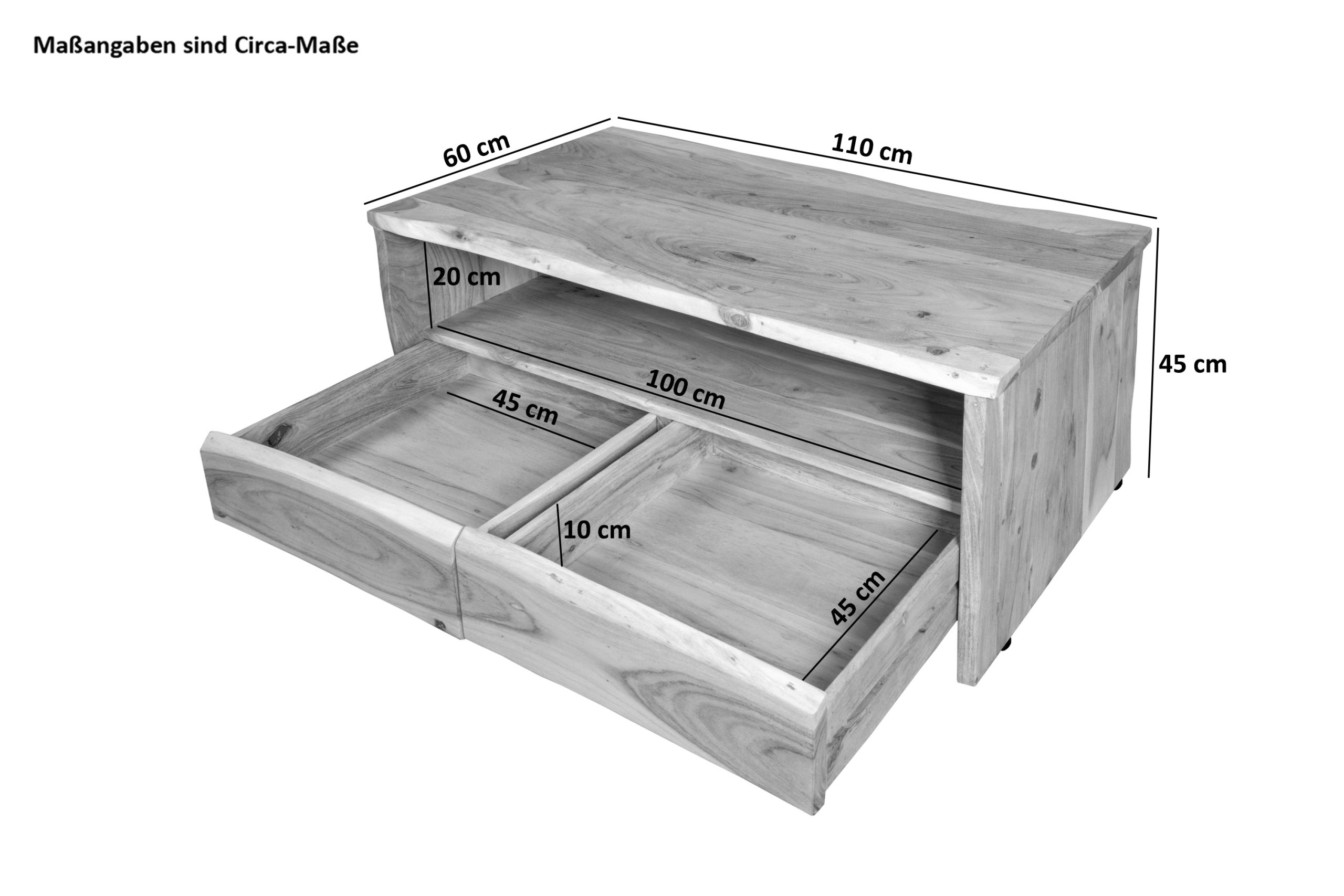 - Gesamtbreite: ca. 110 cm | Gesamtbreite: ca. 60 cm | Gesamthöhe: ca. 45 cm | Tischplattenstärke: ca. 2,6 cm