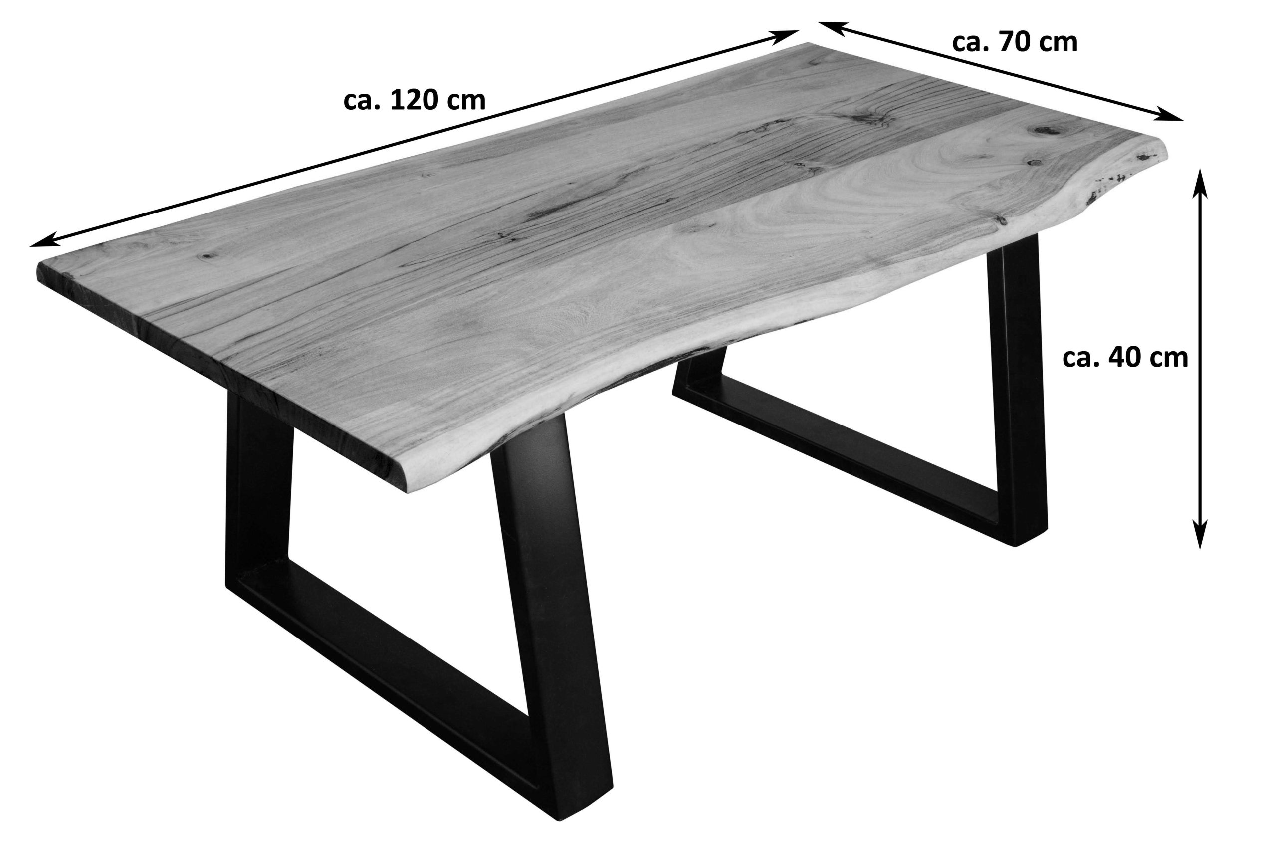 Baumkantentisch Matteo, Couchtisch 120 x 70 cm, Massivholz Akazie, nussbaumfarben / silber