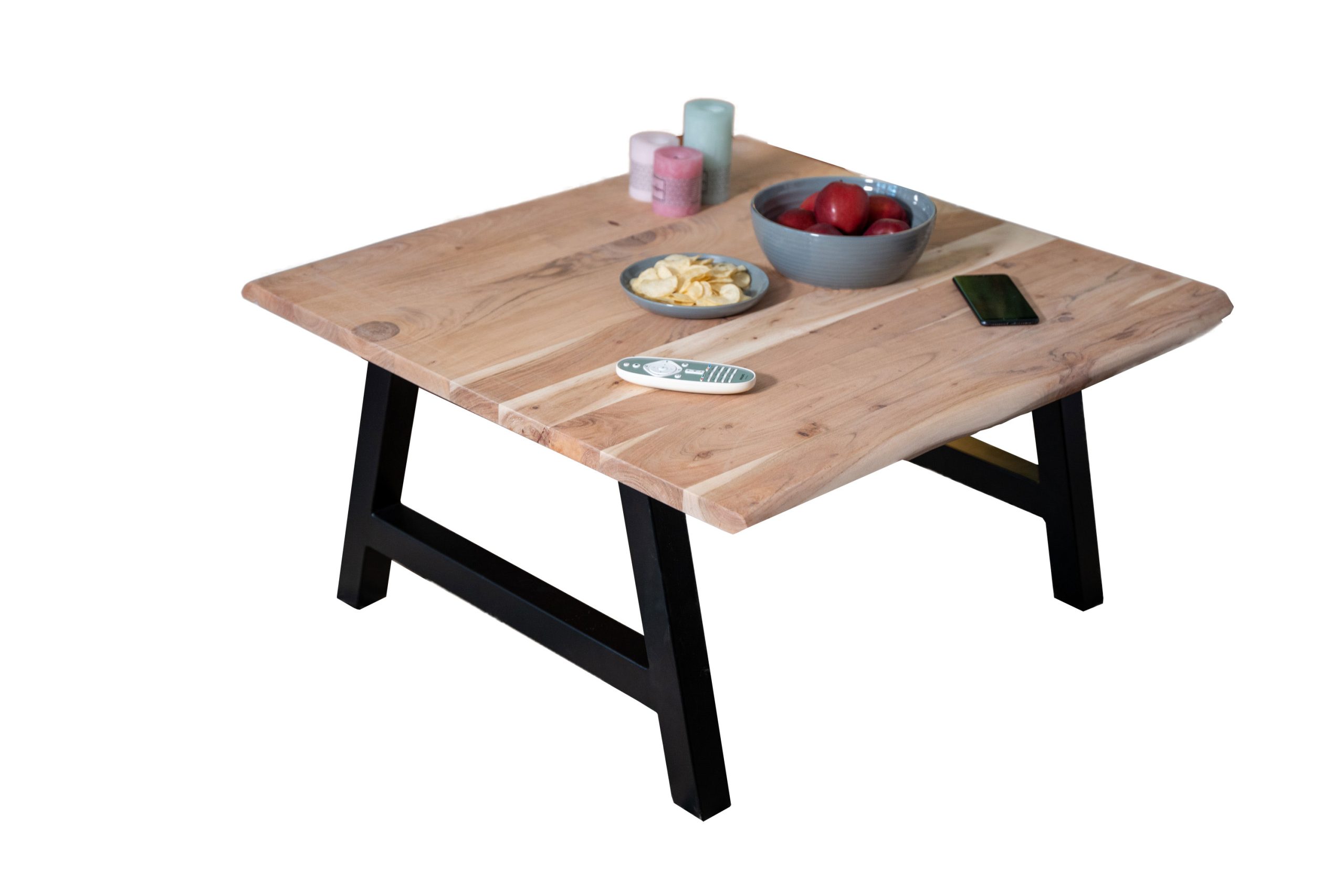 Moderner Couchtisch Quintus, 90×90 cm, Akazie naturfarben, massiv & lackiert, echte Baumkante, schwarzes A-Metallgestell