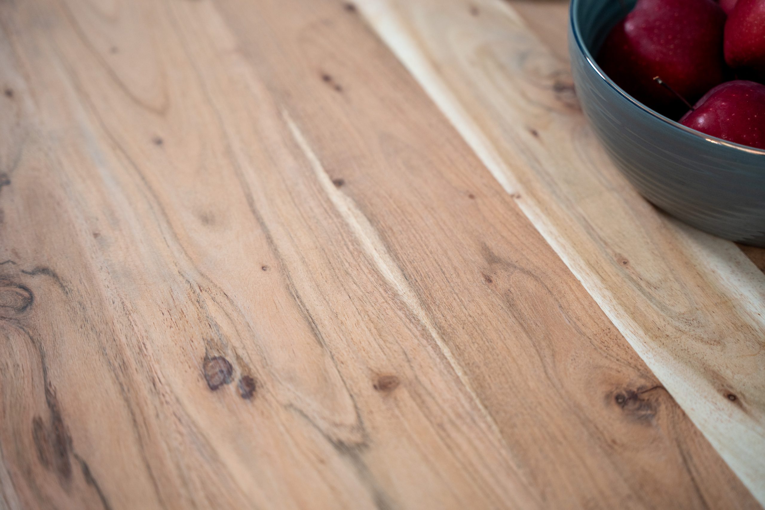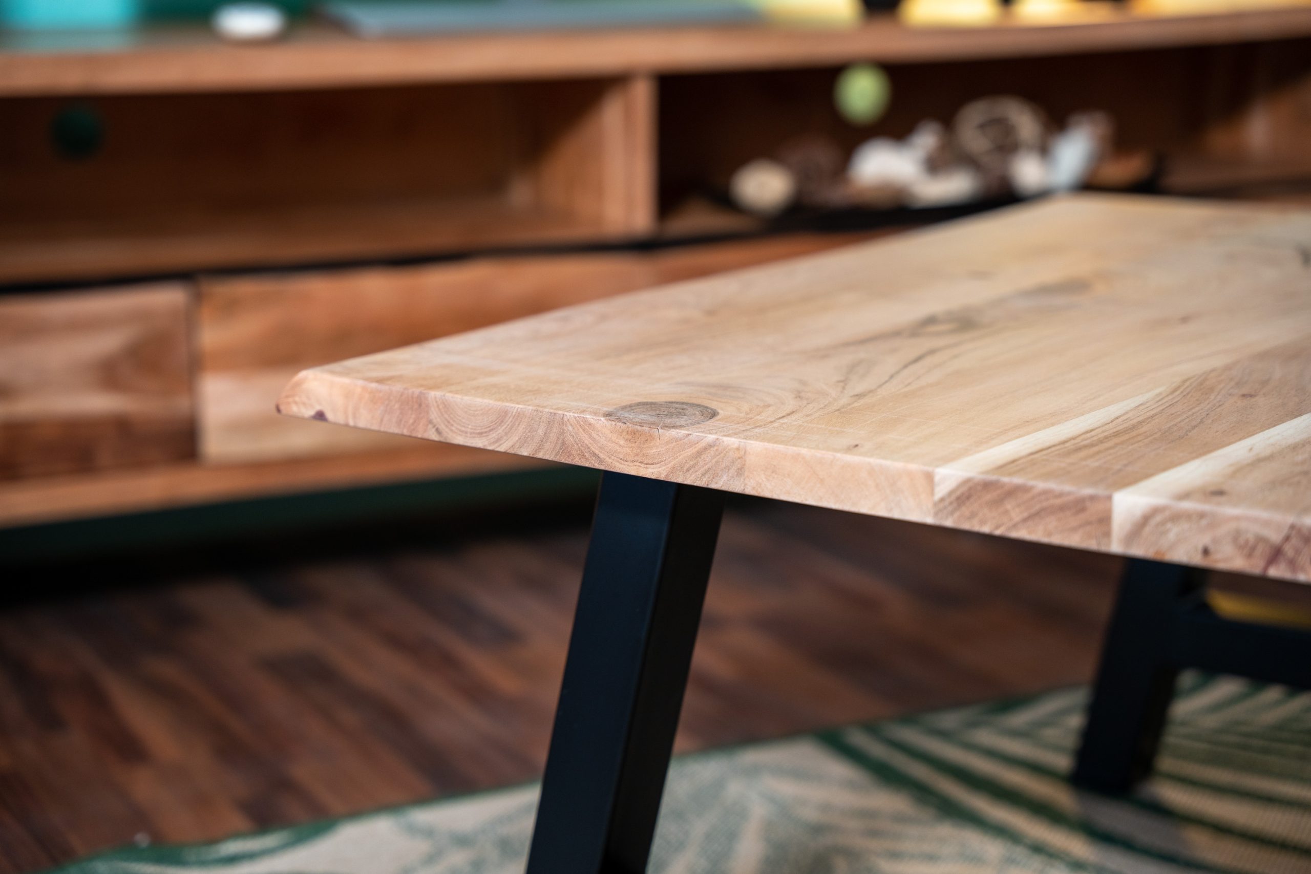 Die Tischplatte ist aus massiver Akazie gefertigt und besteht aus echter und naturbelassener Baumkante. Durch die naturbelassene Optik kann es zu Astlöchern oder unterschiedlichen Farbschmückungen kommen. Diese Unterschiede sind kein Reklamationsgrund, sondern unterstreichen den einzigartigen Charme dieses Möbelstücks.