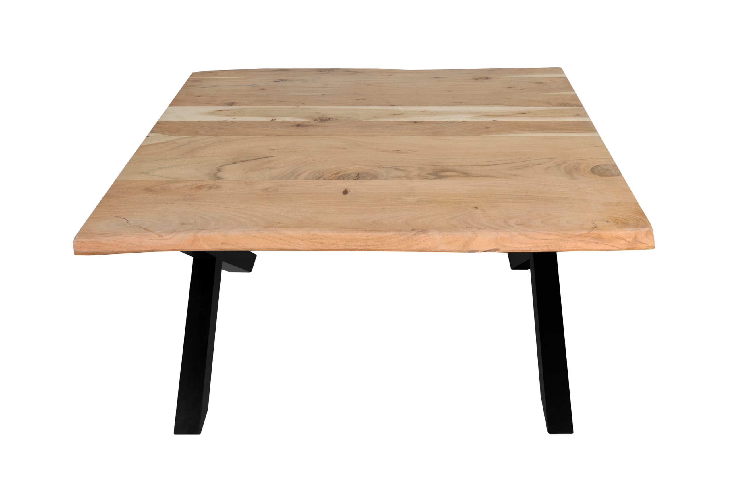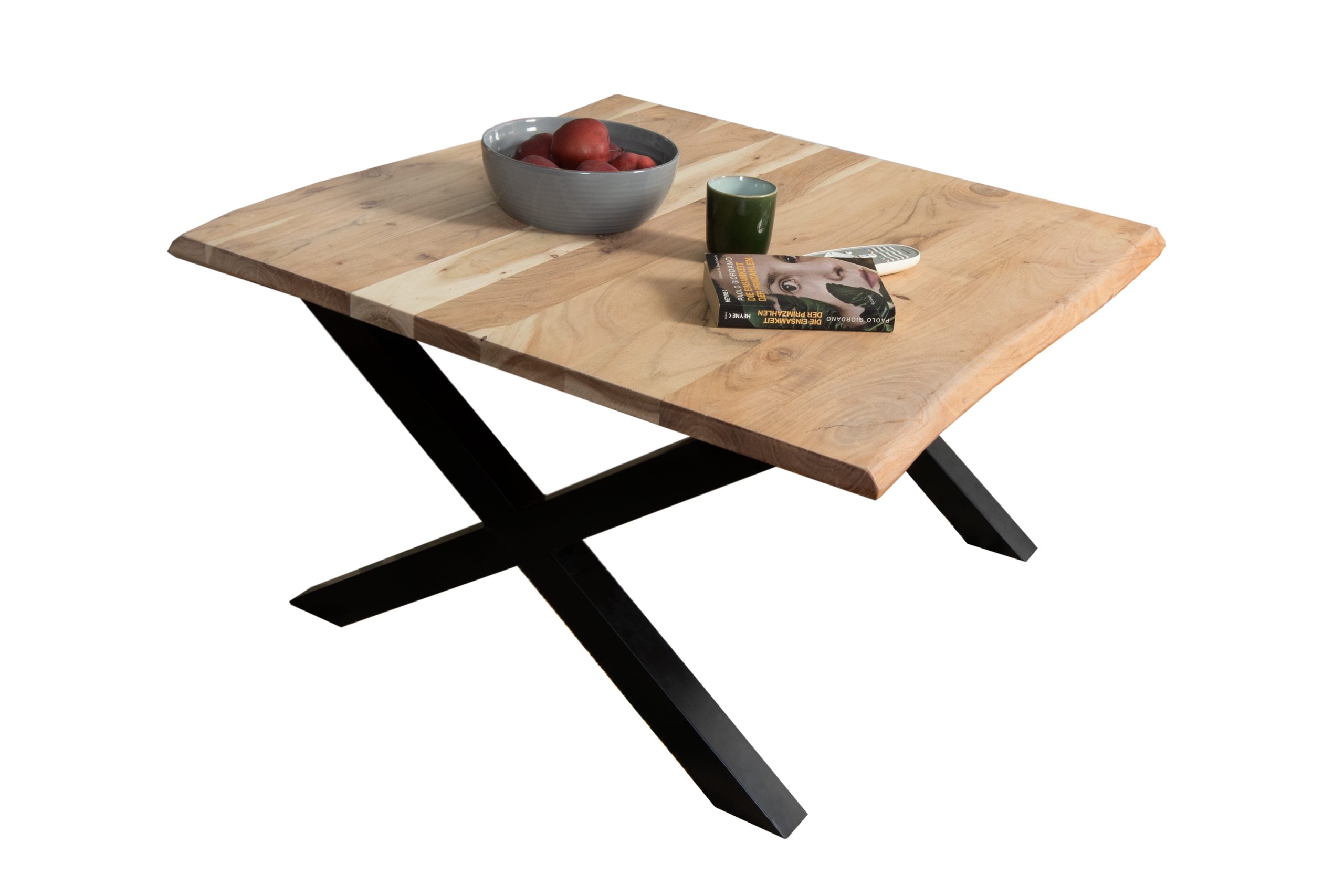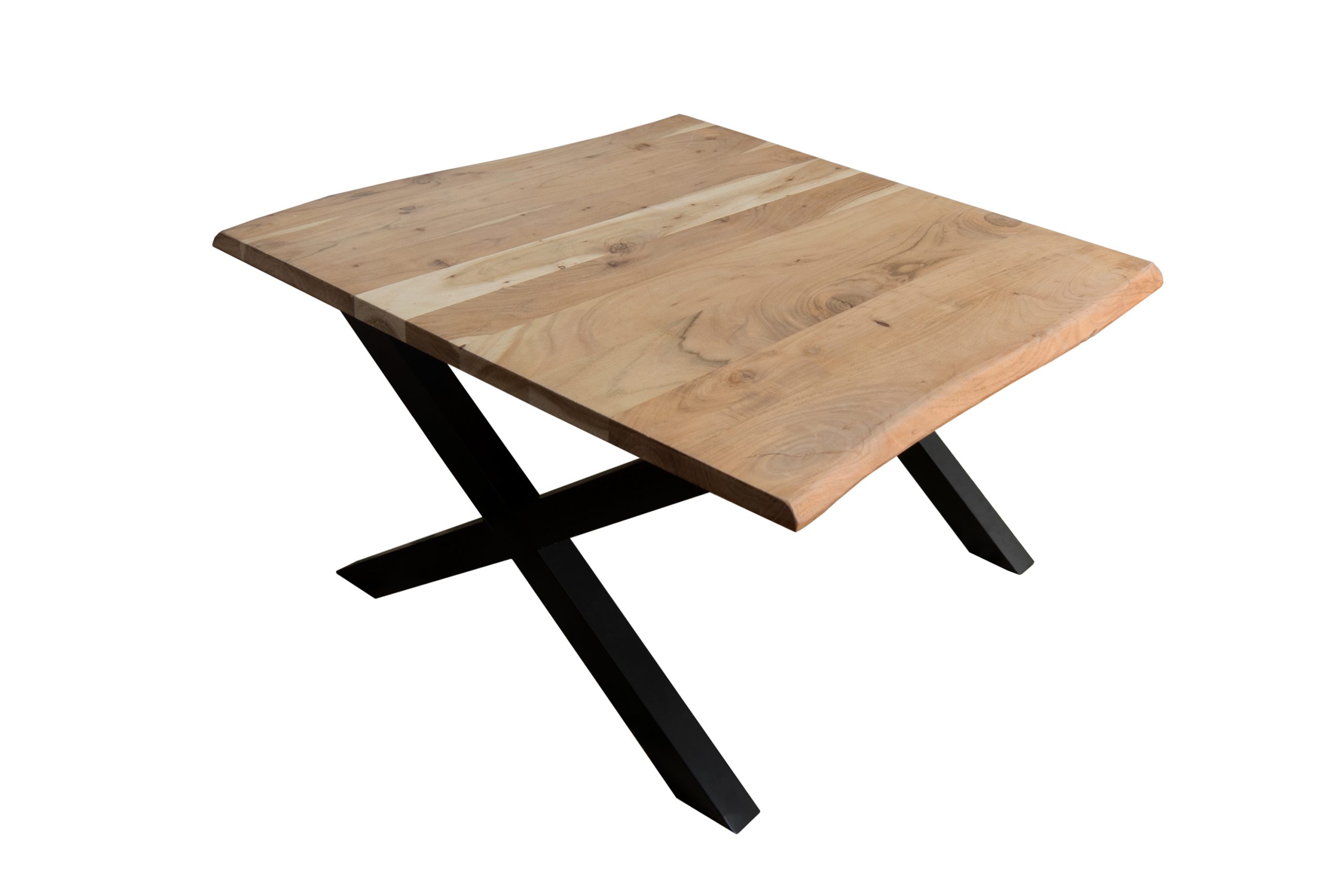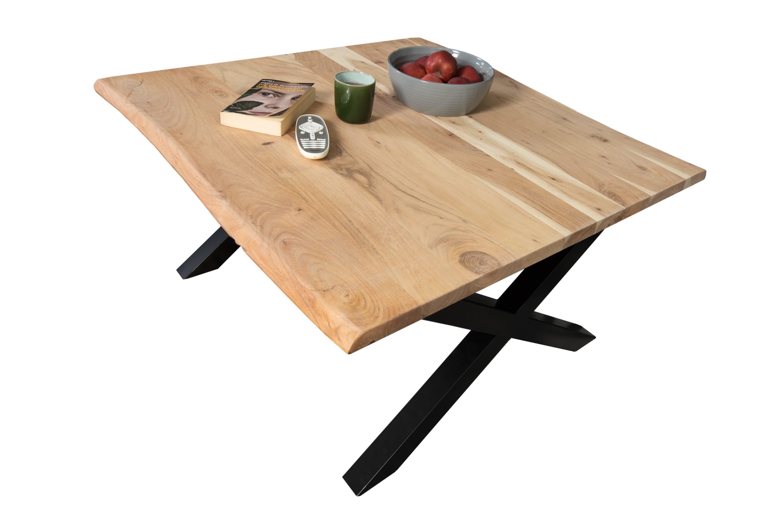 Moderner Couchtisch Quintus, 90×90 cm, Akazie naturfarben, massiv & lackiert, echte Baumkante, schwarzes X-Metallgestell