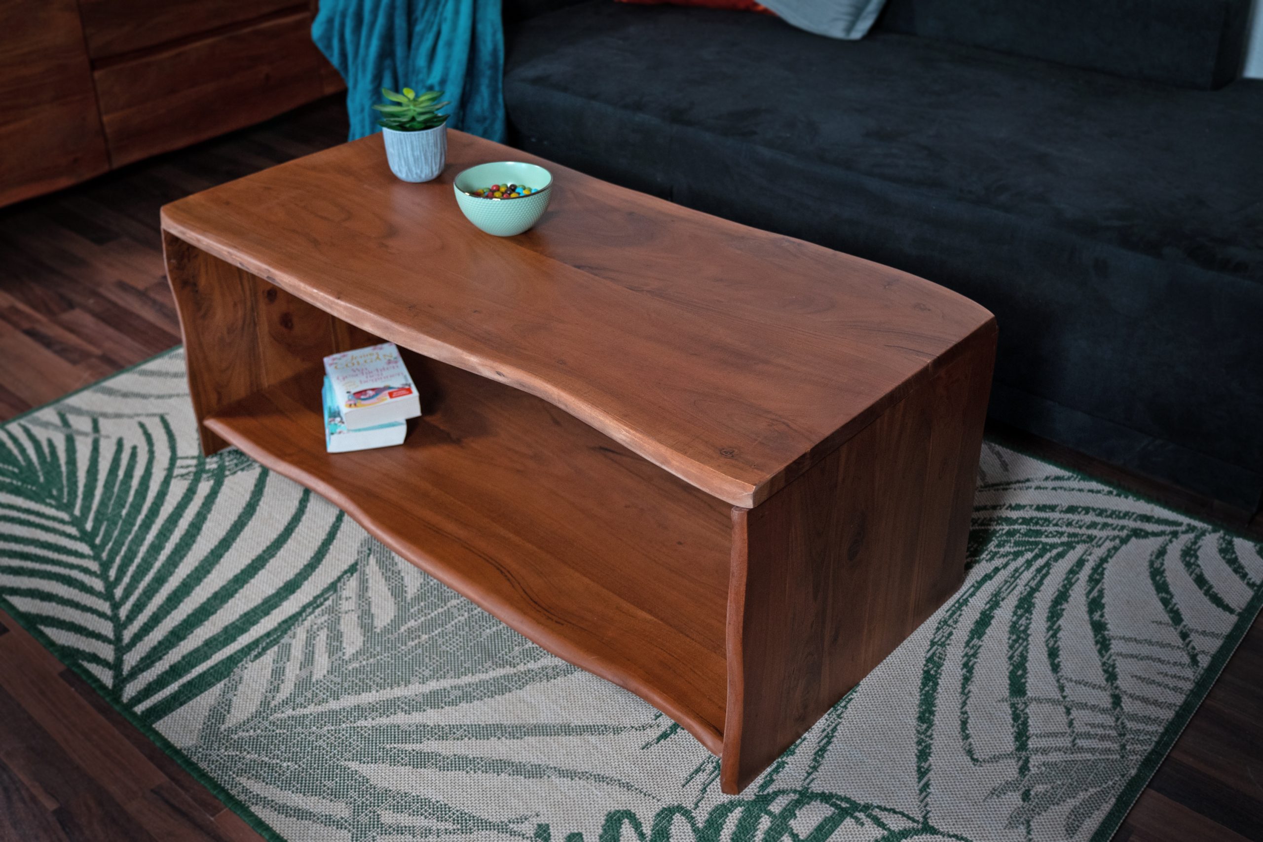• Der Couchtisch besteht aus nussbaumfarbenem und lackiertem Akazienholz und ist aus echter Baumkante gefertigt.