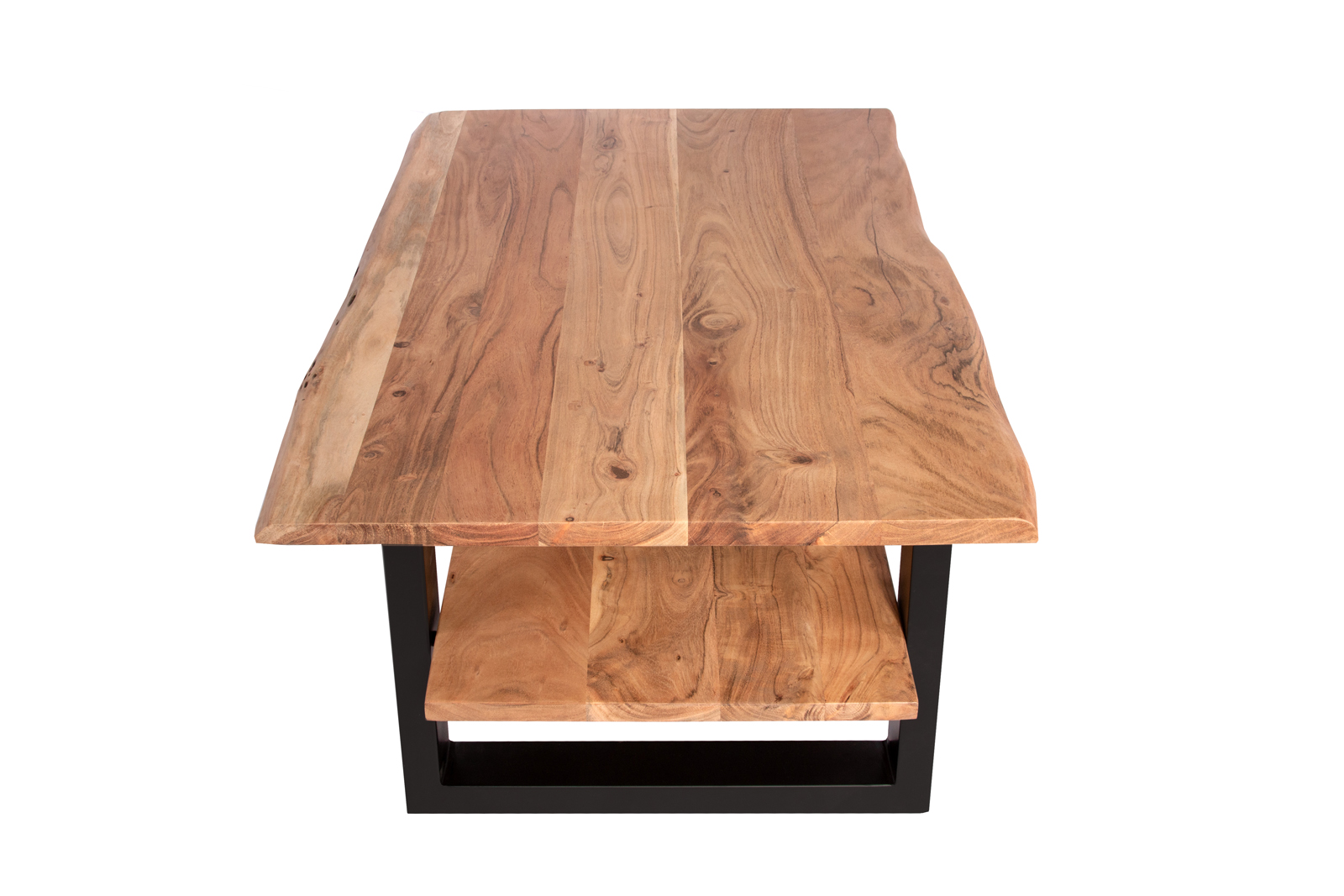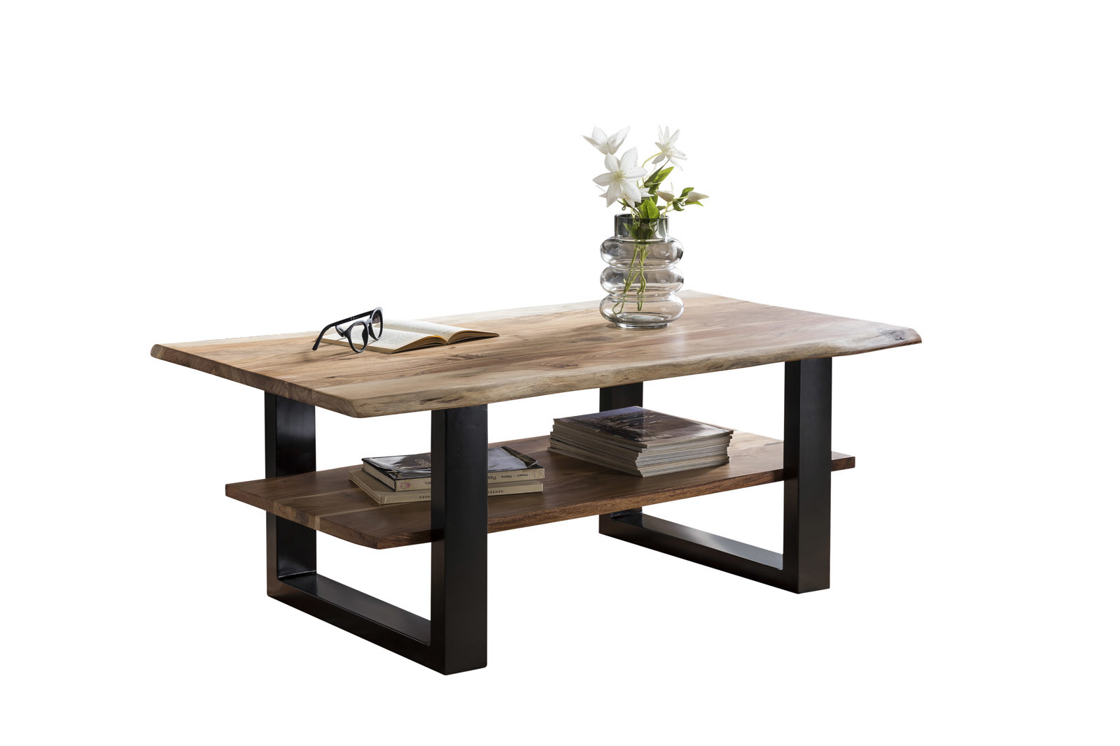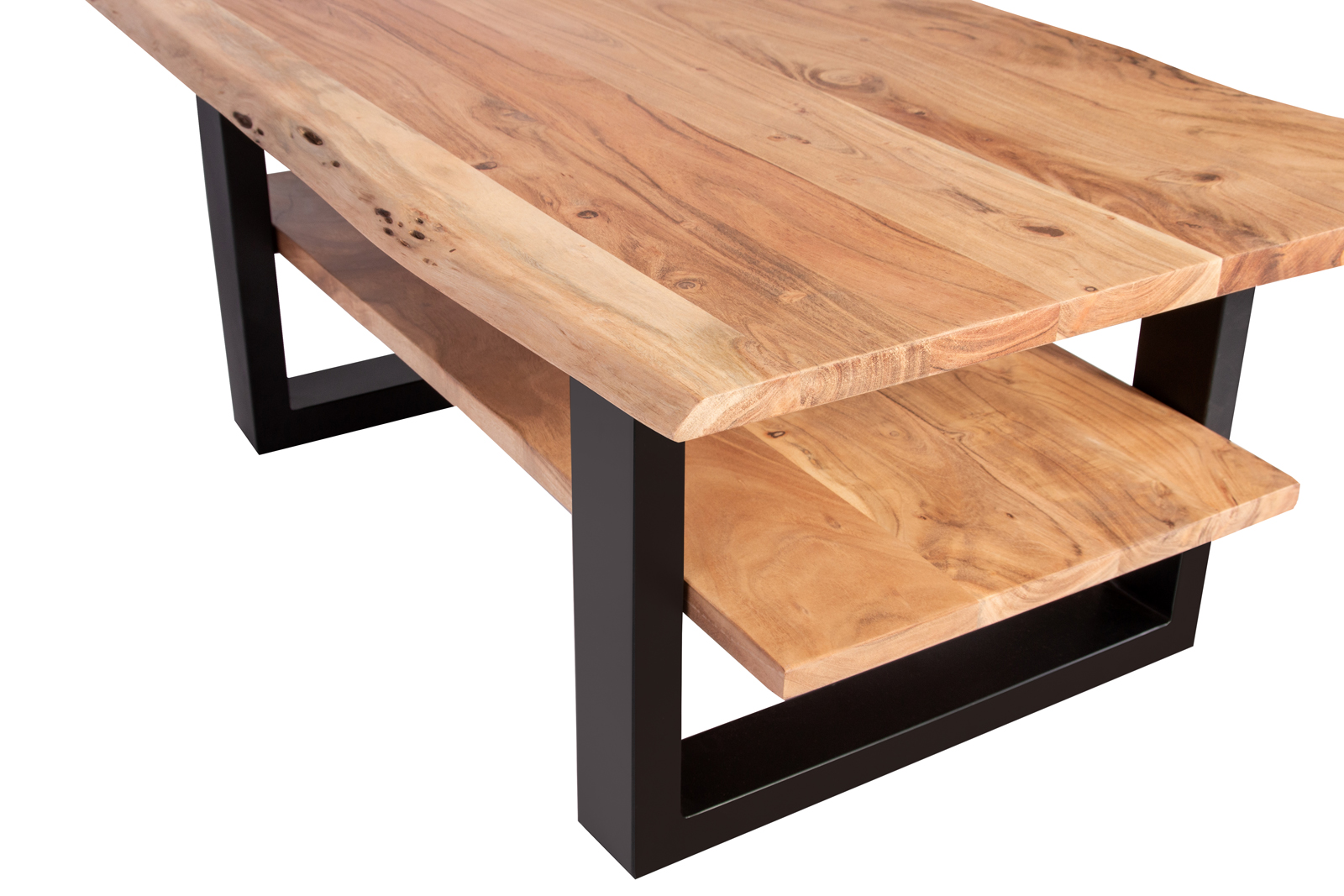 Praktischer Couchtisch Patrick mit Ablage, 115×65 cm, Akazienholz massiv + naturfarben, schwarz lackiertes U-Metallgestell, echte Baumkante