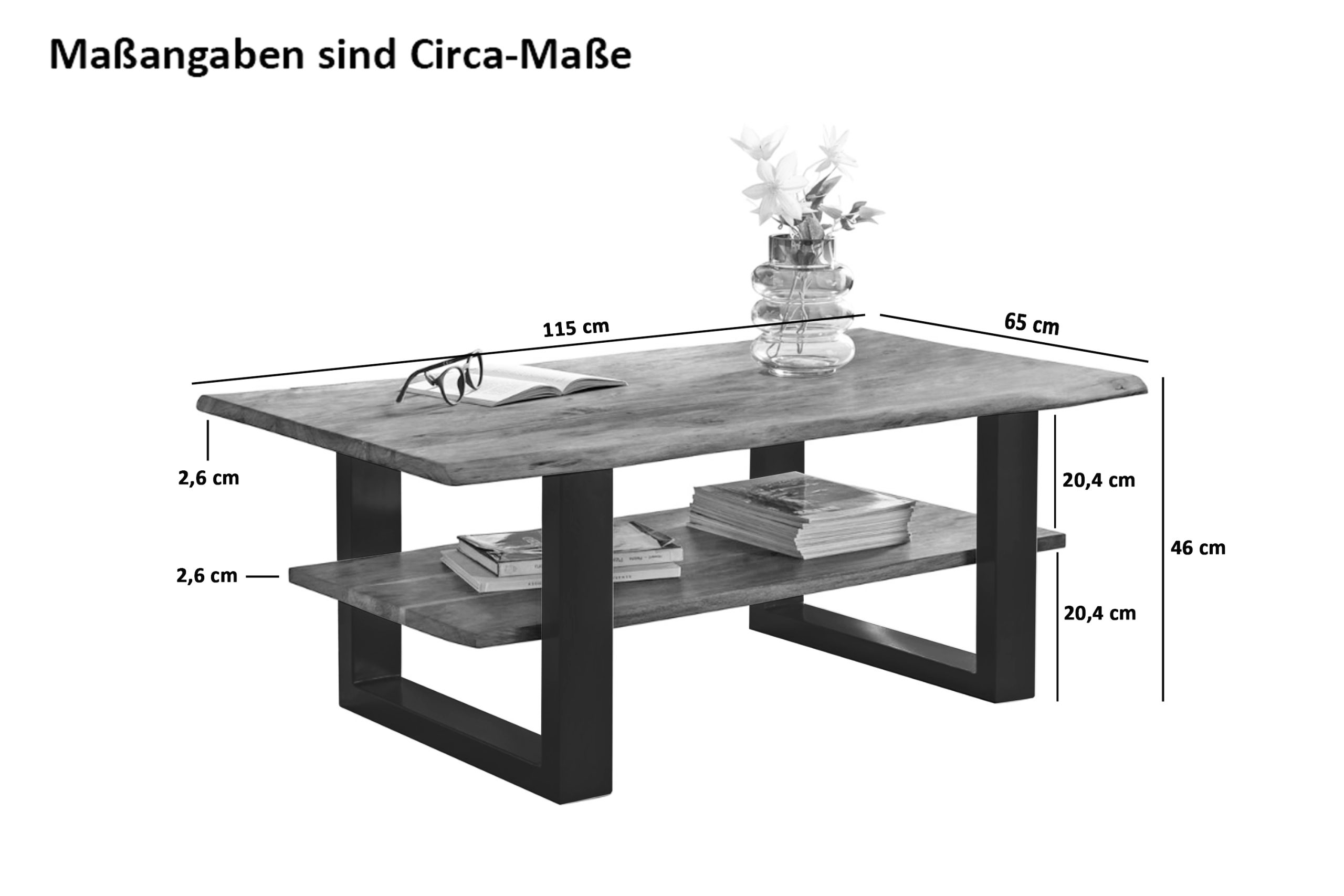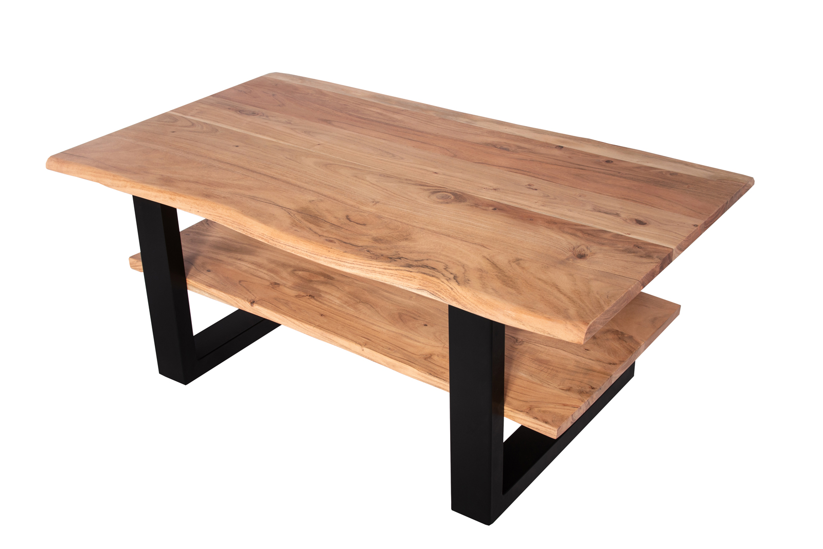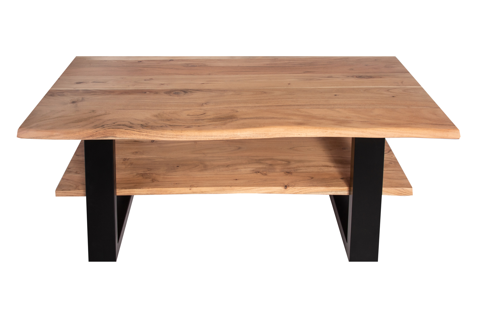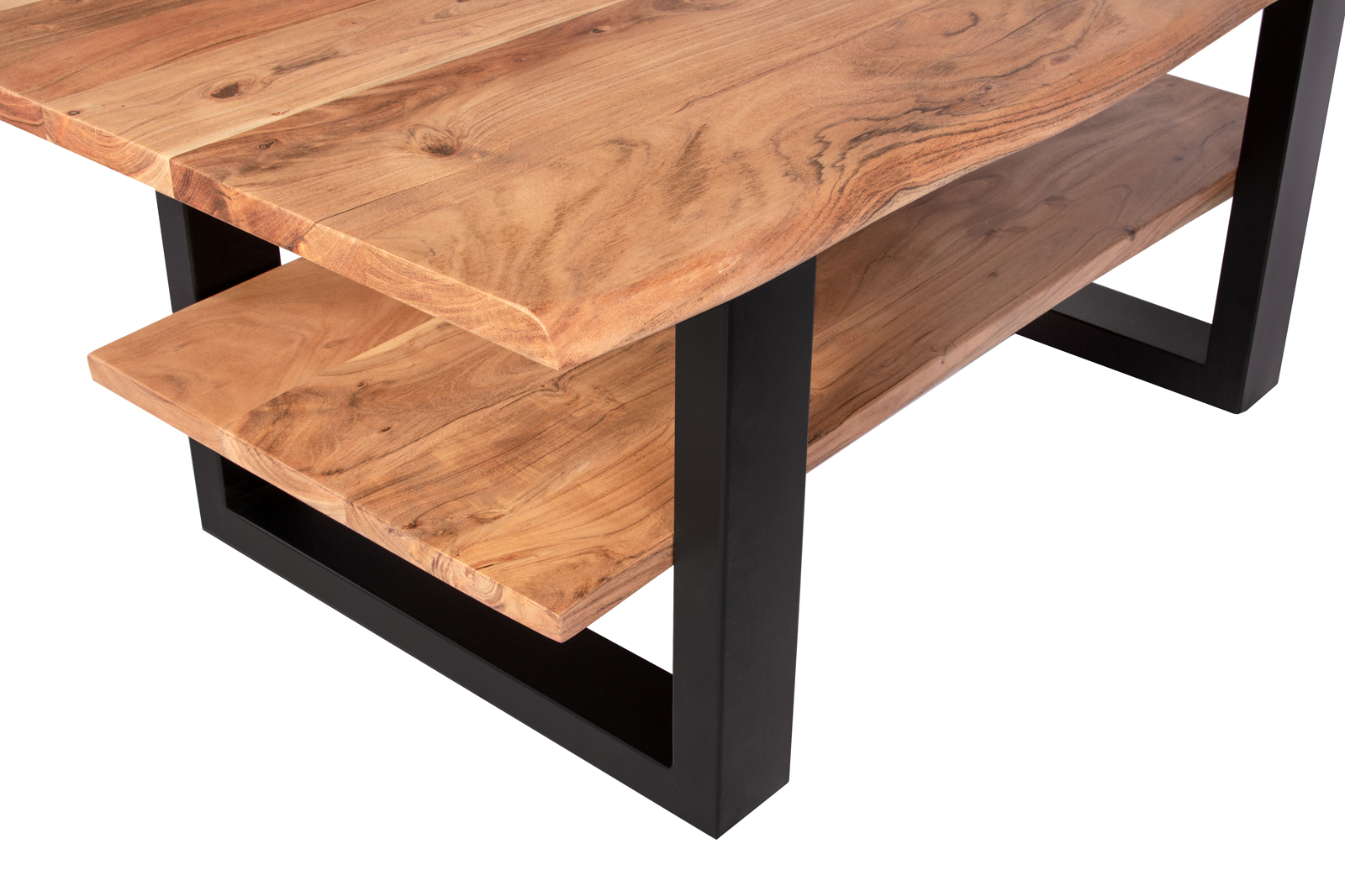 Praktischer Couchtisch Patrick mit Ablage, 115×65 cm, Akazienholz massiv + naturfarben, schwarz lackiertes U-Metallgestell, echte Baumkante