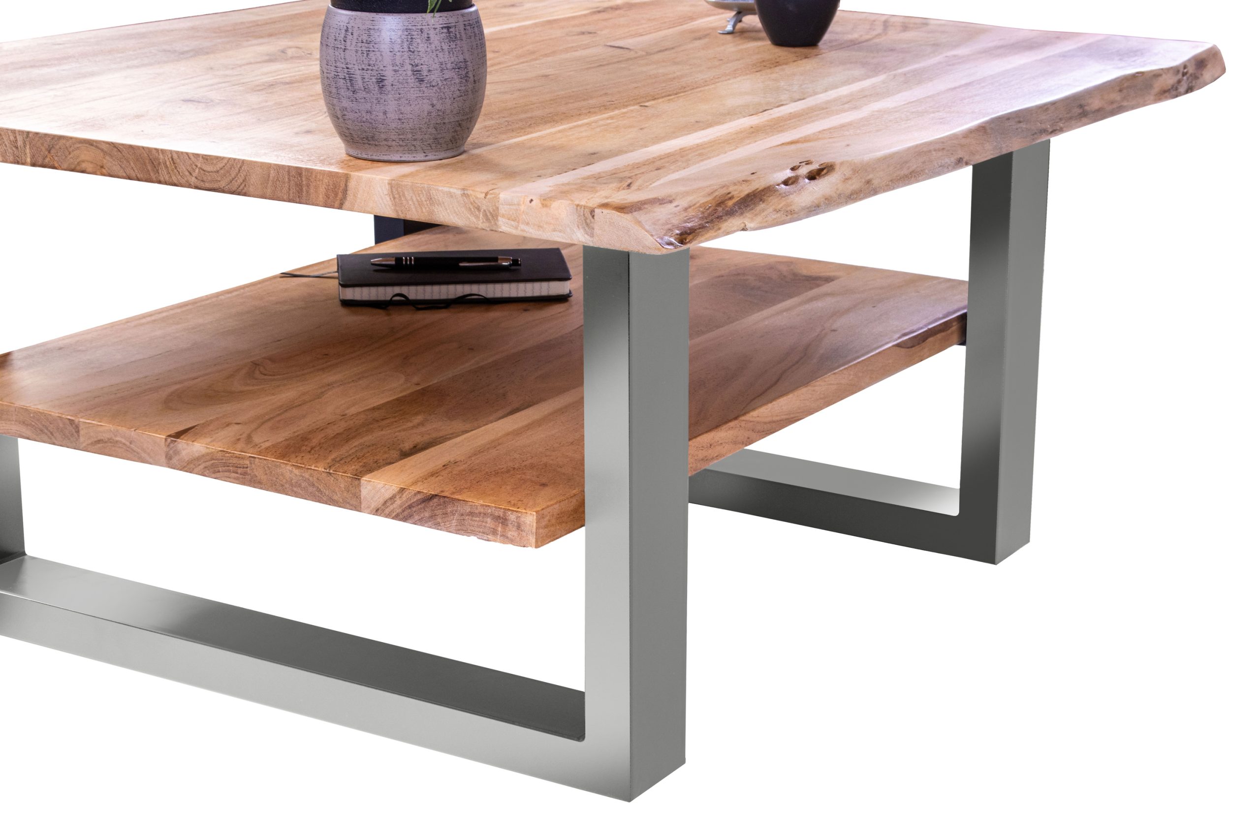 Praktischer Couchtisch Patrick mit Ablage, 90×90 cm, Akazienholz massiv + naturfarben, silber lackiertes U-Metallgestell, echte Baumkante
