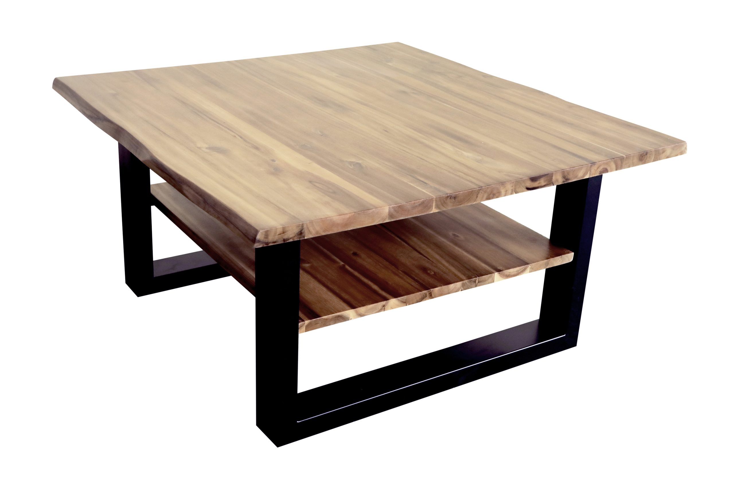 Praktischer Couchtisch Patrick mit Ablage, 90×90 cm, Akazienholz massiv + natur lackiert, schwarz lackiertes U-Metallgestell, echte Baumkante