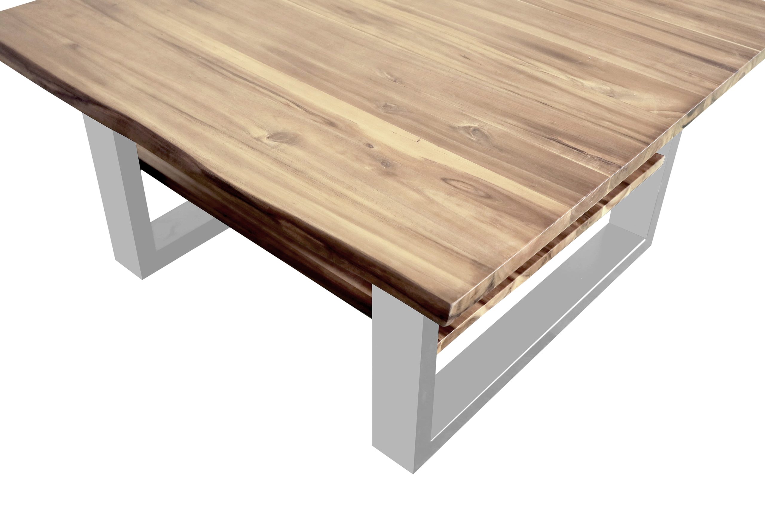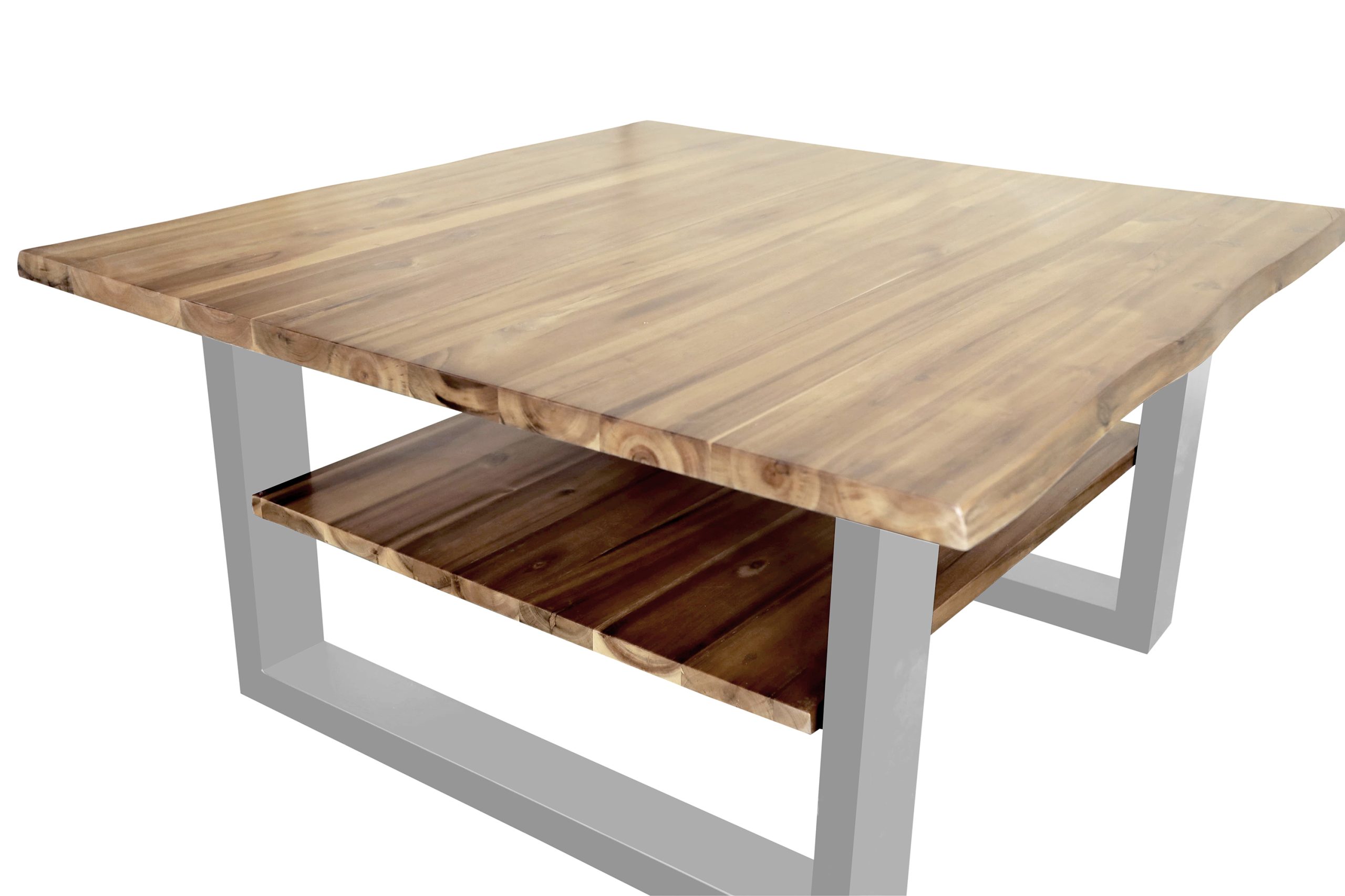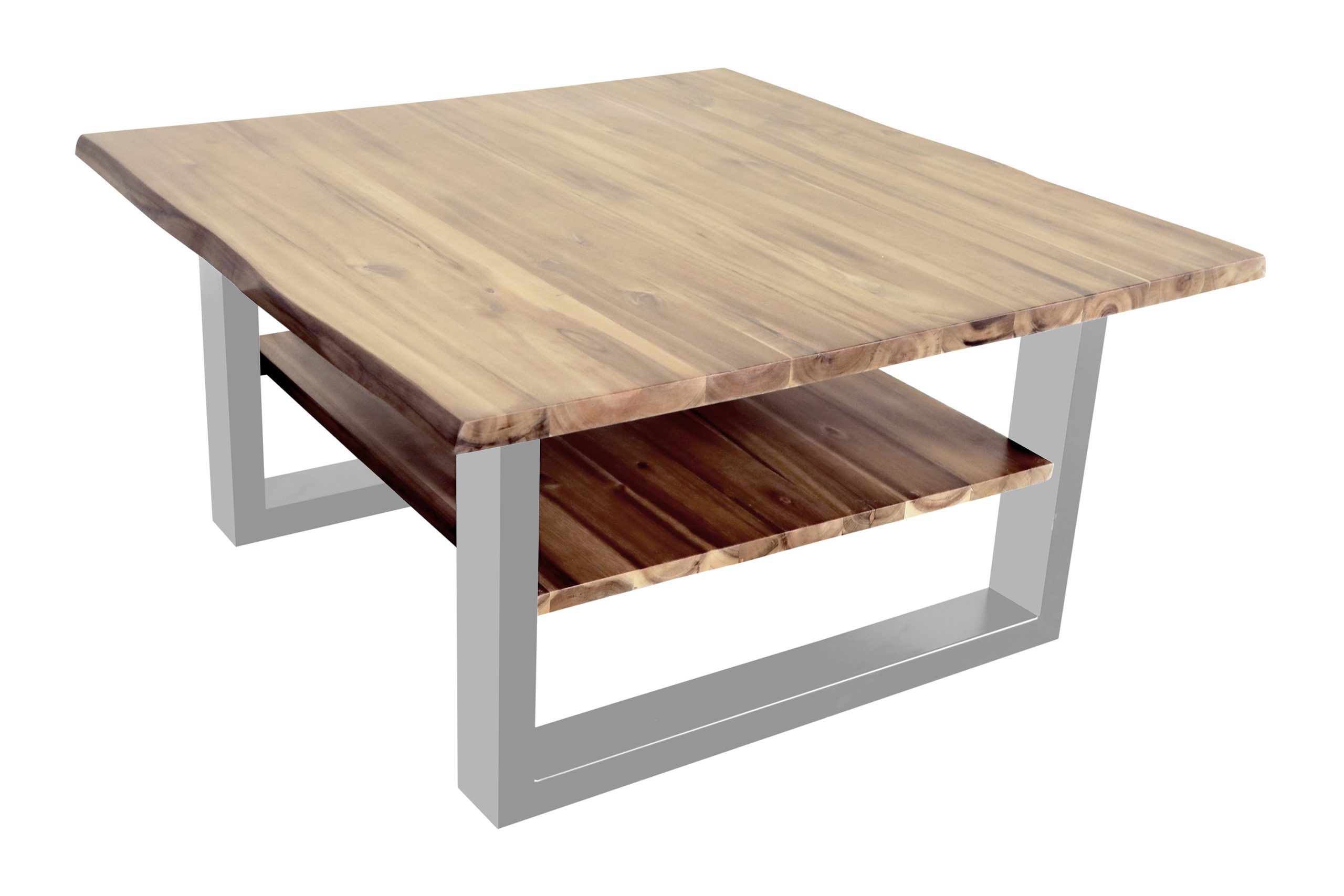 Praktischer Couchtisch Patrick mit Ablage, 90×90 cm, Akazienholz massiv + natur lackiert, silber lackiertes U-Metallgestell, echte Baumkante