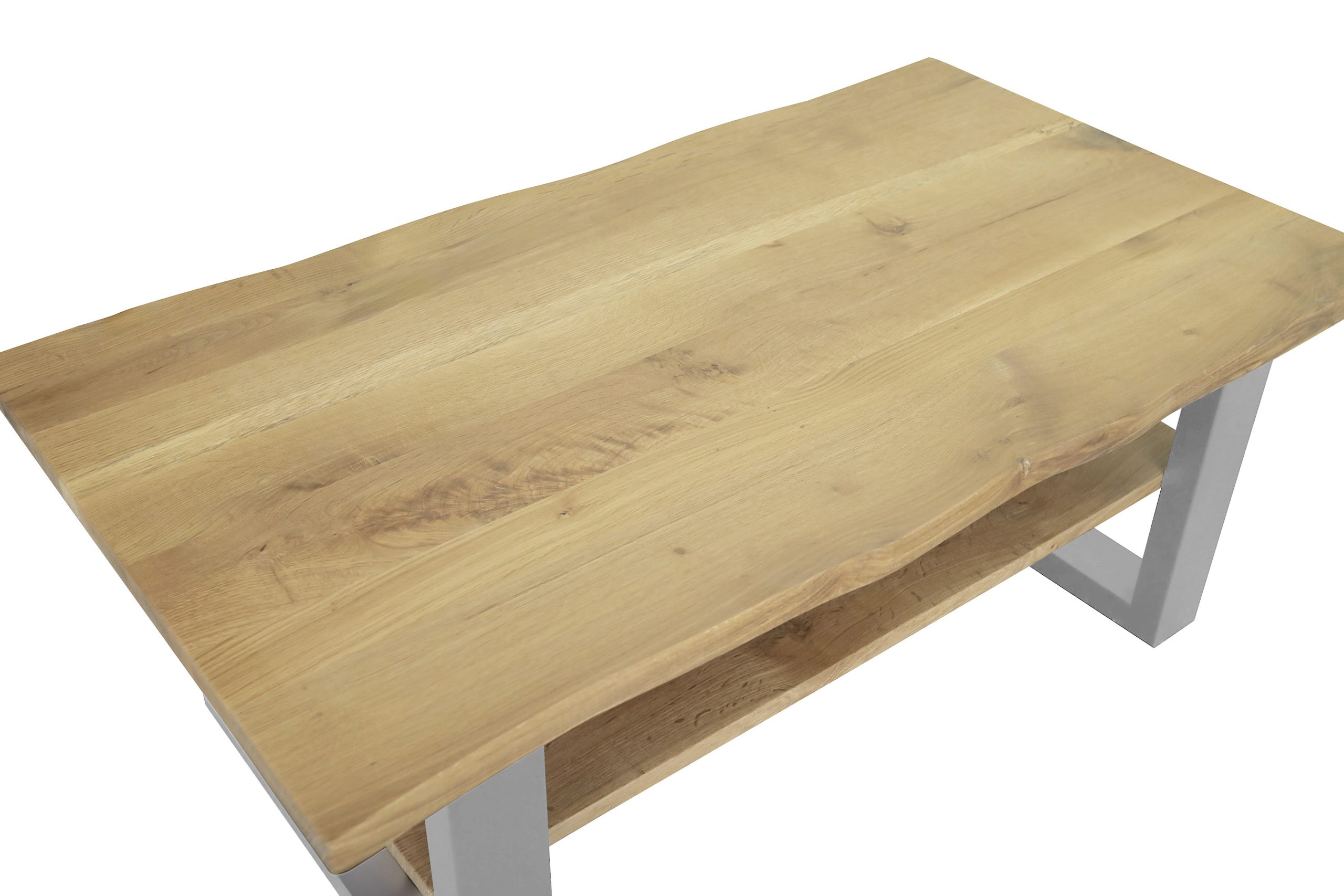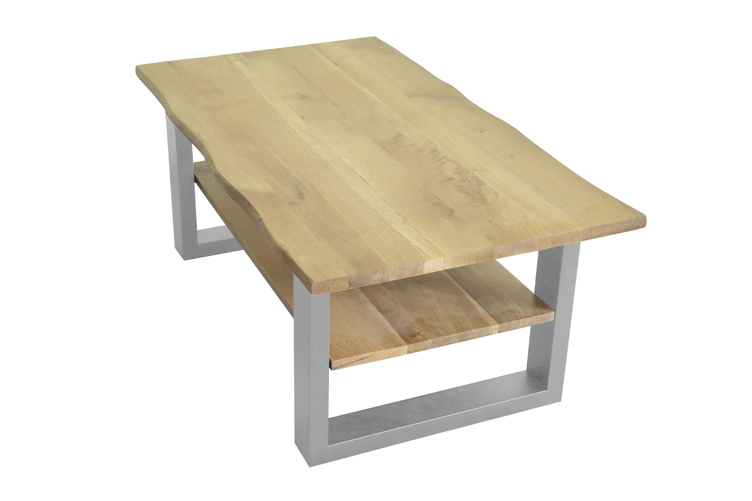Praktischer Couchtisch Patrick mit Ablage, 115×65 cm, Eichenholz massiv + geölt, silber lackiertes U-Metallgestell, echte Baumkante