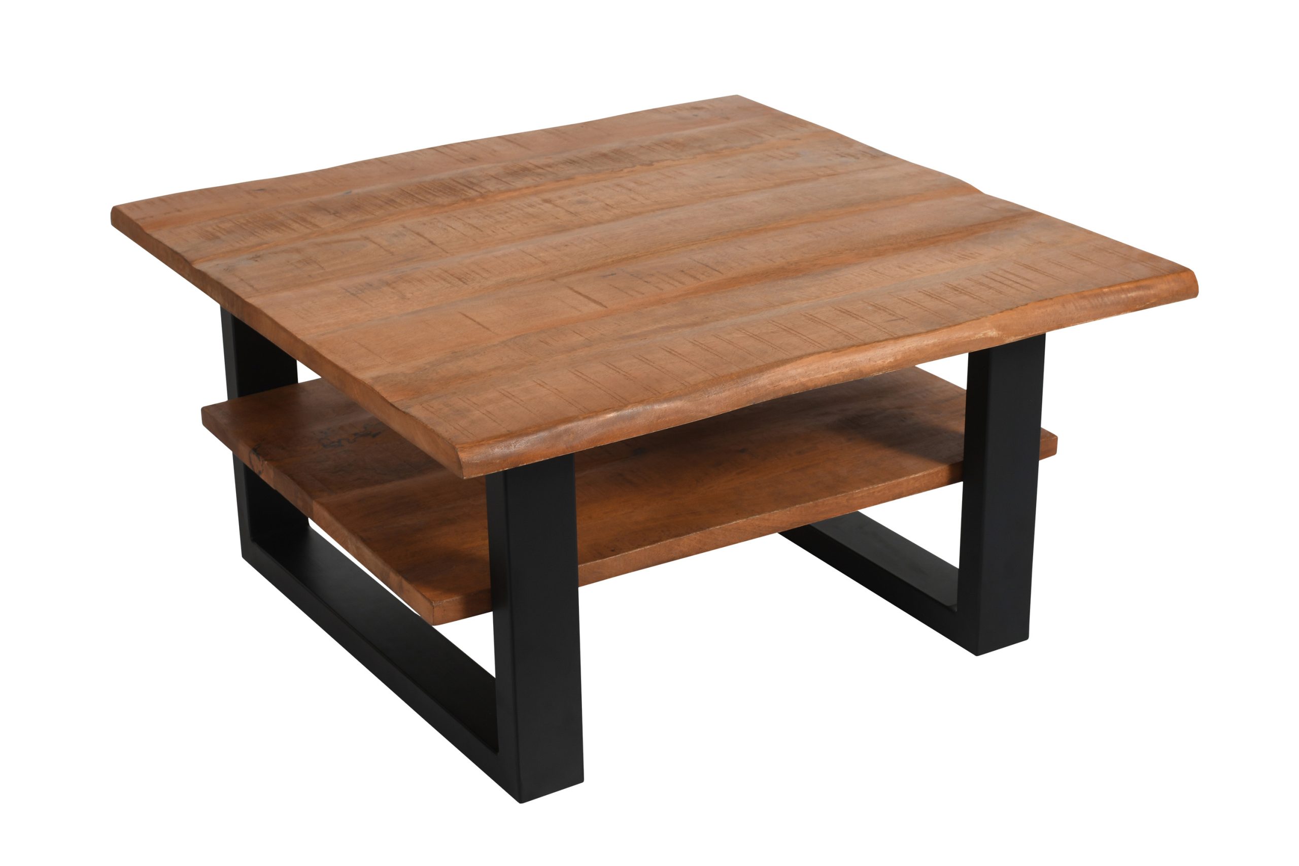 Moderner Couchtisch Patrick mit Ablage, 90×90 cm, Mangoholz massiv + honigfarben, U-Metallgestell Schwarz, echte Baumkante