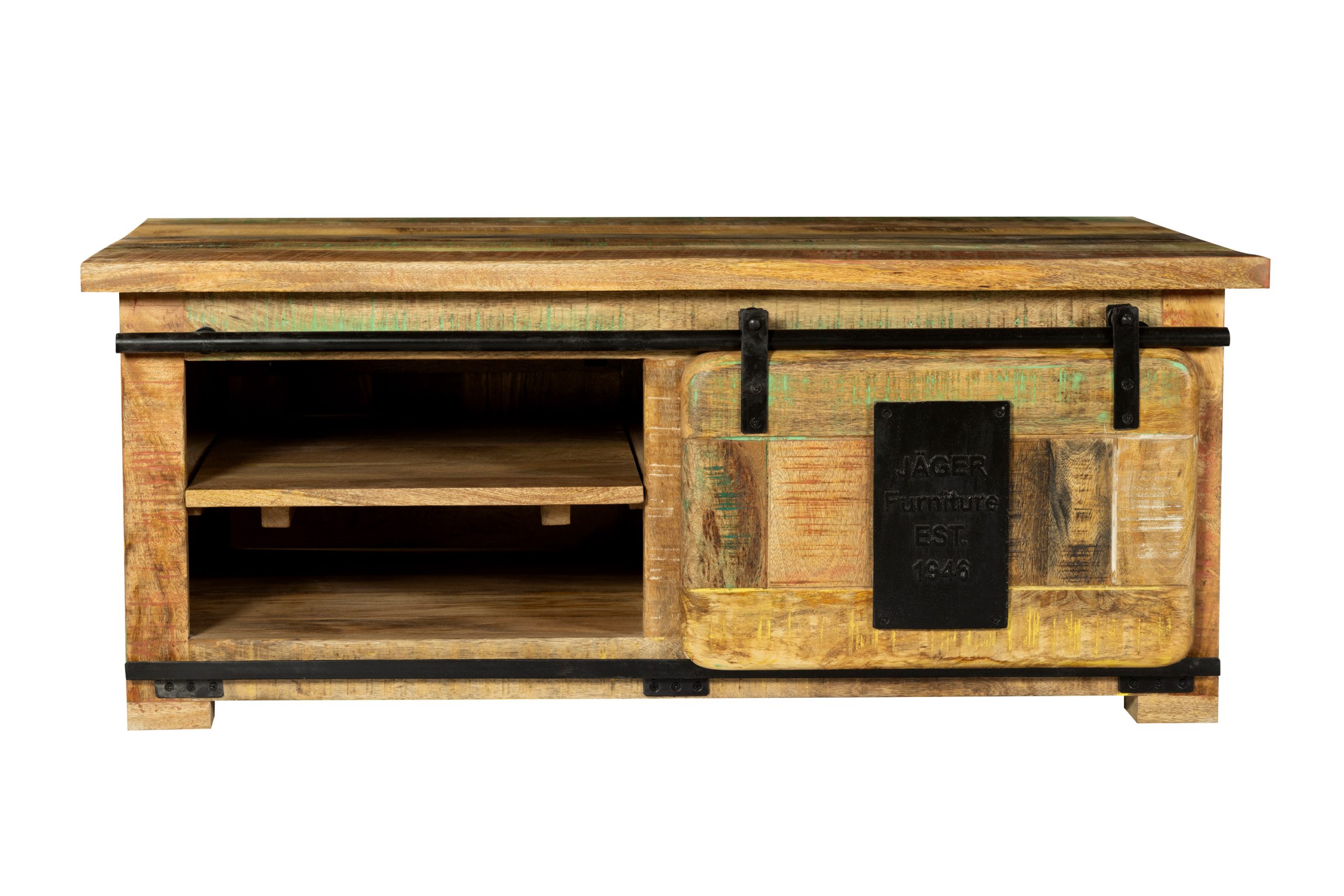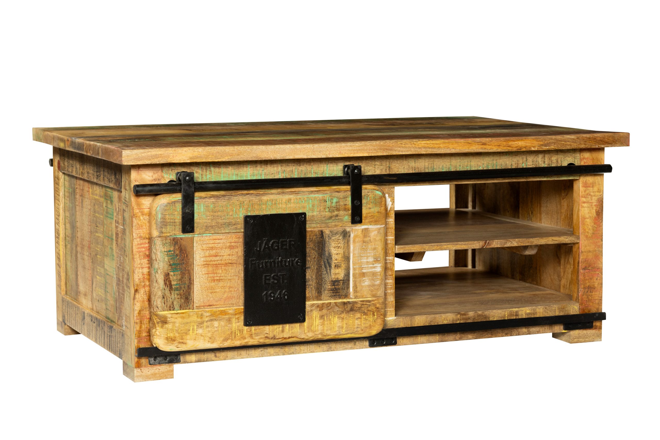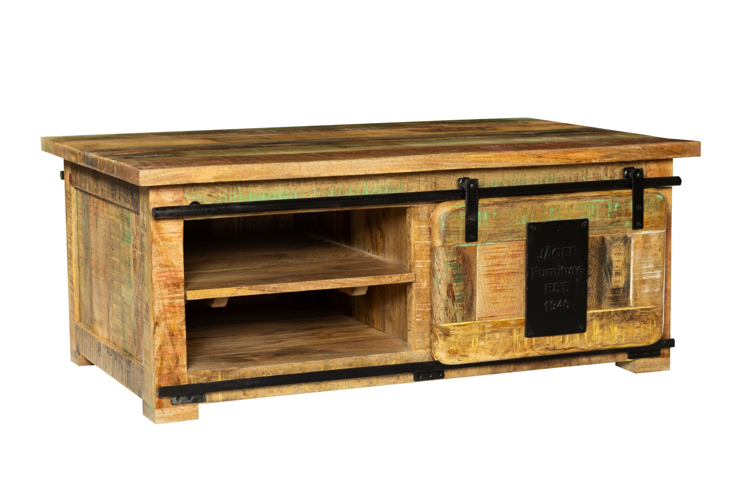 Hochwertiges Couchtisch Libro, Mangoholz massiv + bunt, mit Holzschiebetür & 3 offenen Fächern, 110 x 45 x 70 cm
