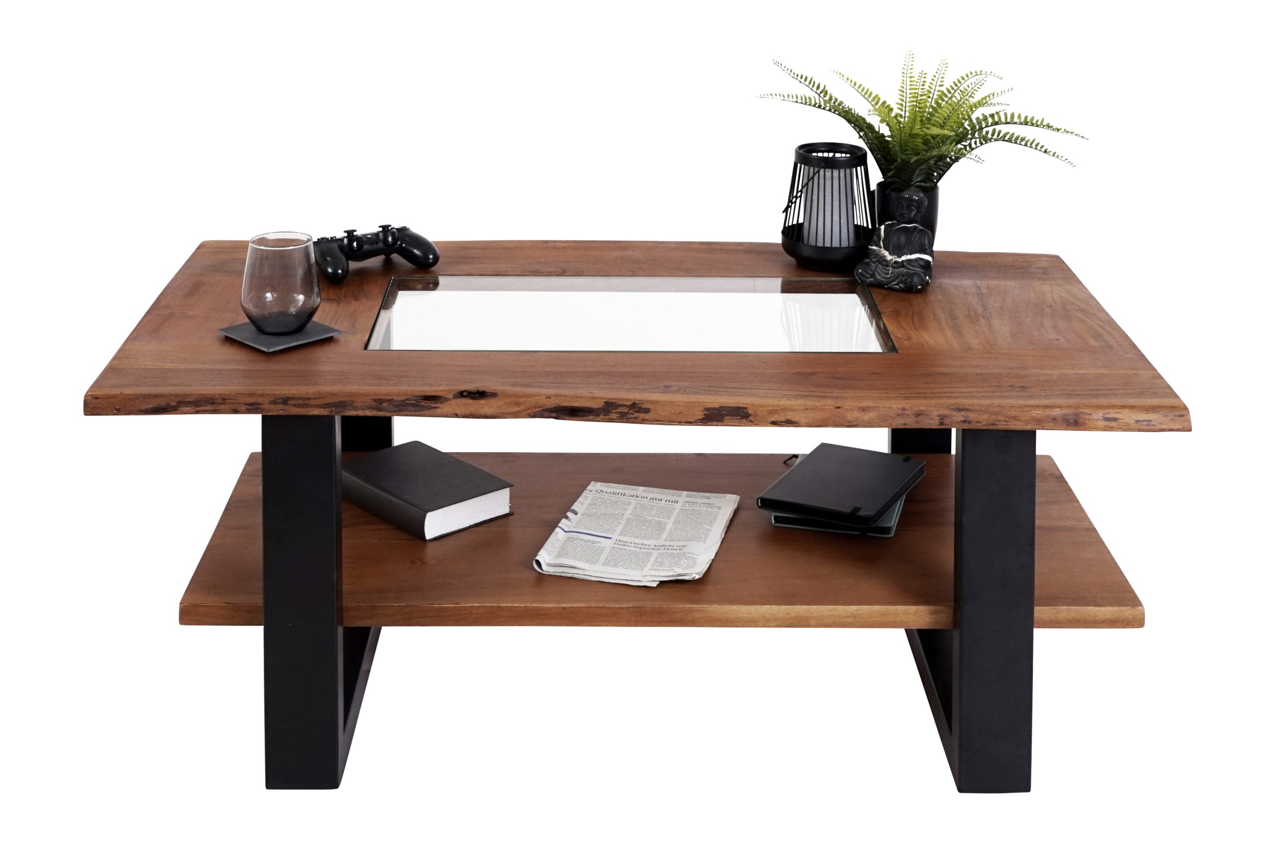 Moderner Couchtisch Patrick mit Ablage und Glaseinlage, 115×65 cm, Akazienholz massiv + nussbaumfarben, schwarz lackiertes U-Metallgestell, echte Baumkante