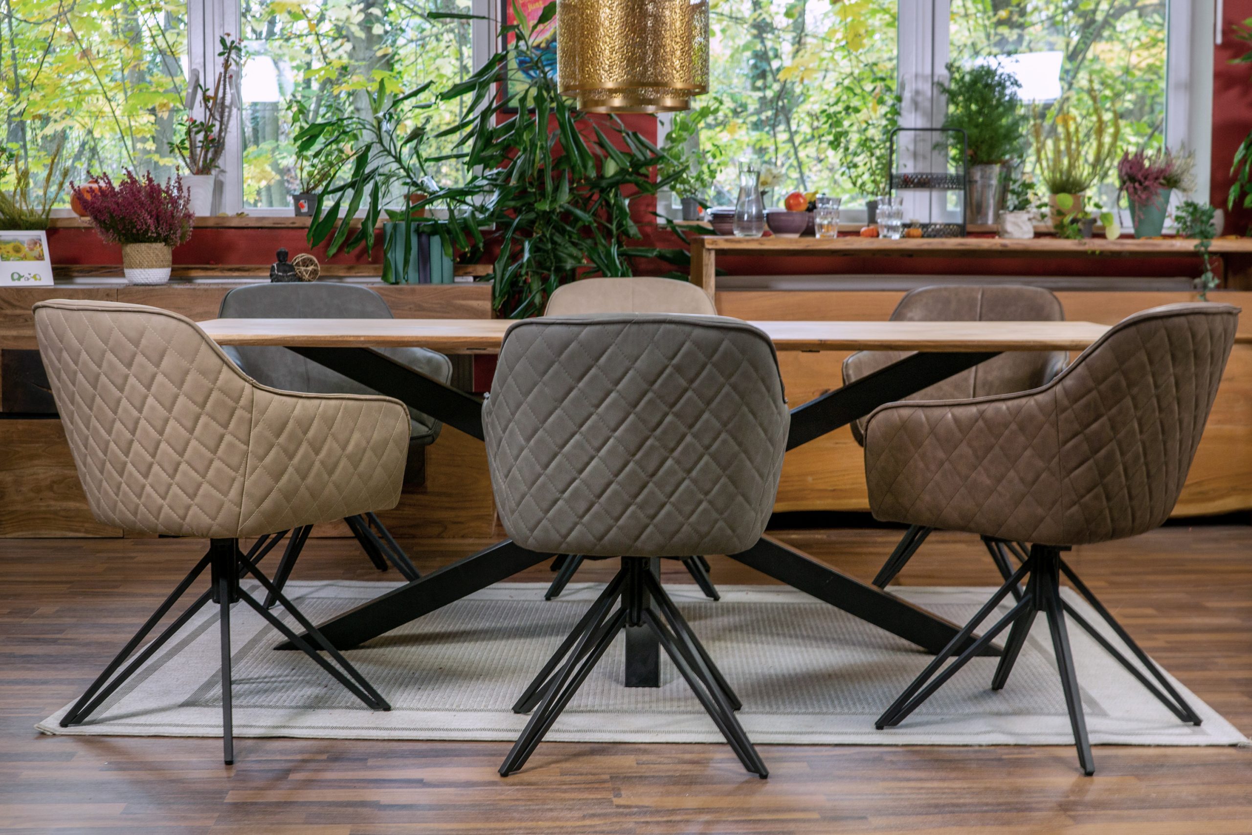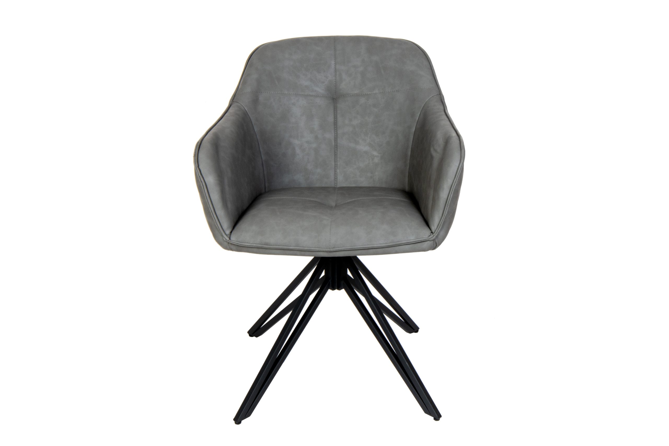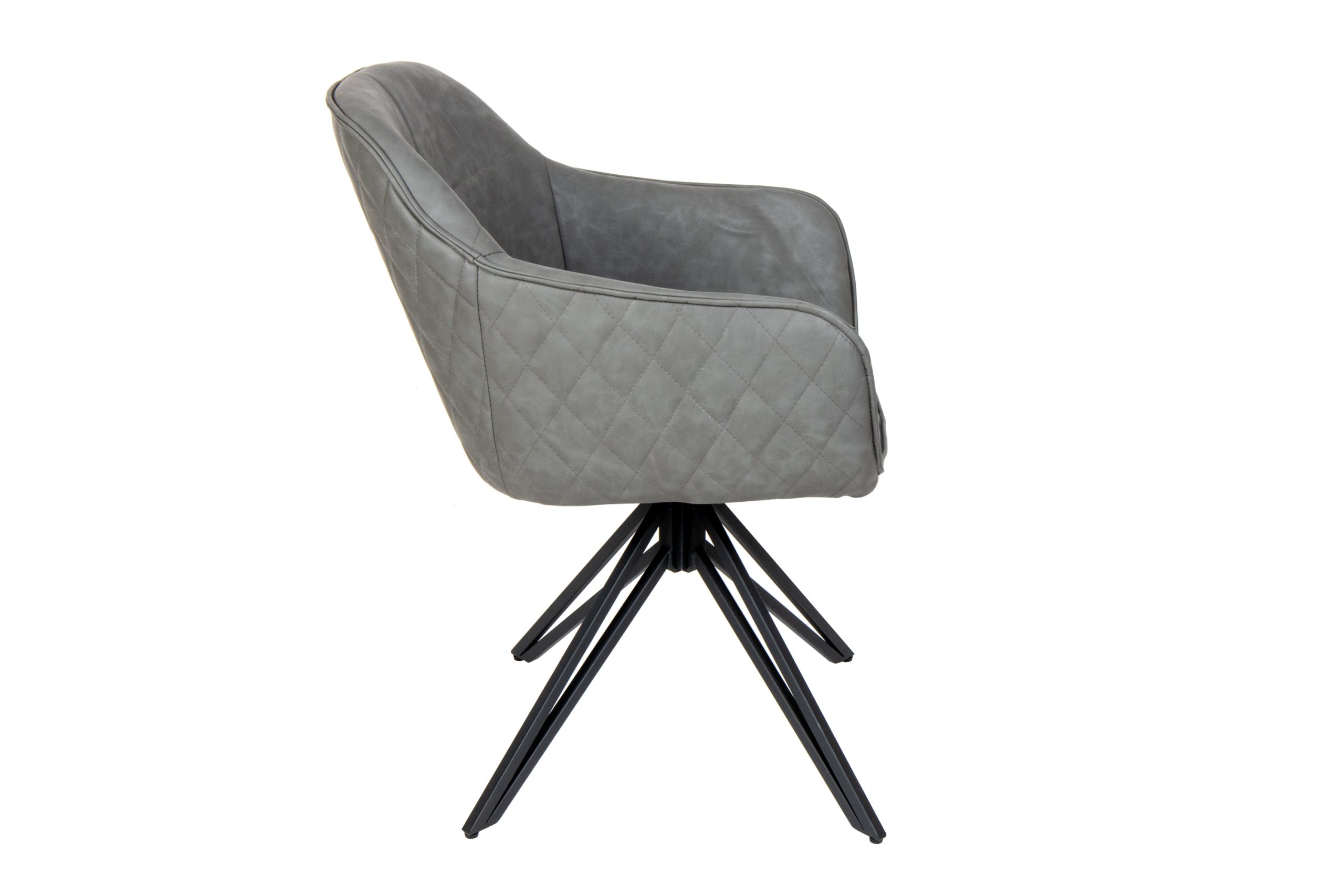 Dieser charmante Armlehnstuhl im skandinavischen Design ist eine Bereicherung, ob als Esszimmerstuhl oder einfach als Einzelstück am Schreibtisch. Durch die ergonomisch geformte Rückenlehne und die bequeme Polsterung bietet Ihnen dieses Modell höchsten Sitzkomfort. Nehmen Sie Platz und erleben Sie, wie jedes Beisammensitzen mit der Familie zu einer wahren Freude wird! Die schwarzen Metallfüße bilden einen tollen Kontrast zu dem Kunstlederbezug in Anthrazit. Das stilvolle Rautenmuster an der Rückenlehne setzt gezielte Akzente und rundet das charismatische Gesamtbild des Drehstuhls ab.