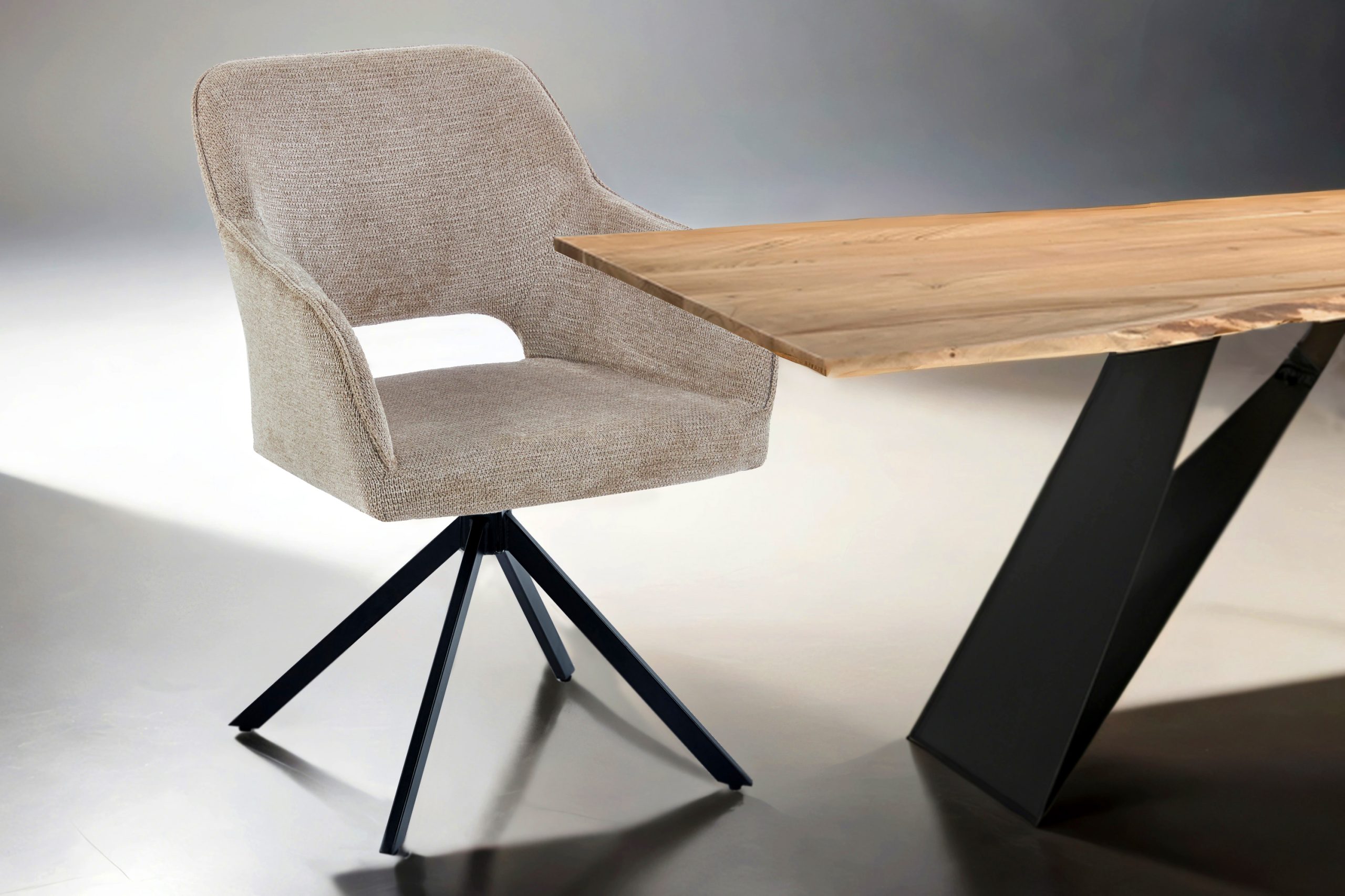 Der Esszimmerstuhl überzeugt durch seine Kombination aus hoher Funktionalität und modernem Komfort. Egal ob im Esszimmer, im Büro oder im Home-Office – der Armlehnstuhl bietet stets eine bequeme und stilvolle Sitzgelegenheit. Der Stuhl bietet volle Bewegungsfreiheit dank seiner 360°-Drehbarkeit. Die Drehfunktion sorgt für eine abwechslungsreiche und komfortable Sitzposition in jeder Situation – egal ob bei Besprechungen oder Abendessen..