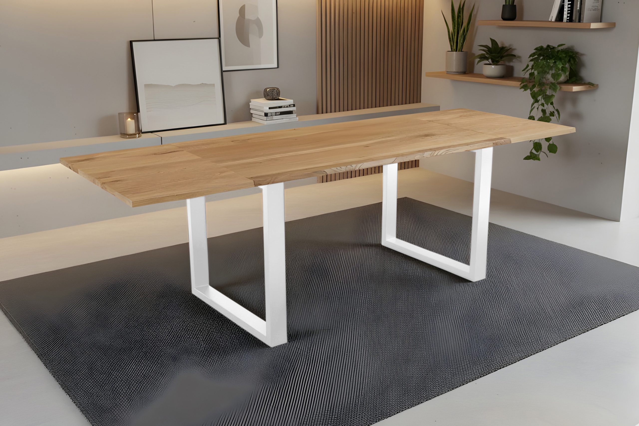 Baumkantentisch Serra | 120–200 x 80 cm | Wildeiche massiv | U-Gestell weiß | Erweiterbar mit Ansteckplatten