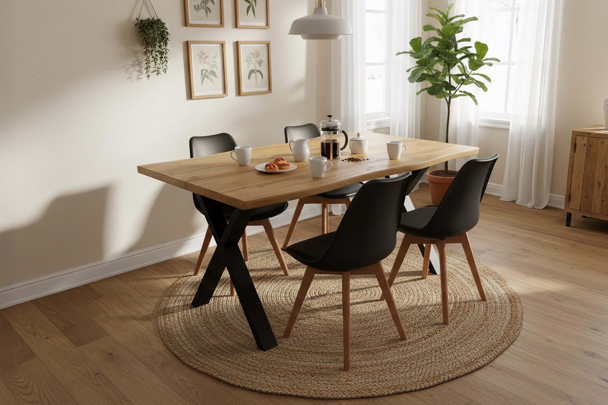 Das schwarze X-Gestell aus Metall sorgt für außergewöhnliche Stabilität und schafft gleichzeitig eine moderne, klare Linienführung. Die großzügigen Maße von 120 x 80 cm machen den Tisch ideal für gemeinsame Mahlzeiten, Homeoffice-Phasen oder gesellige Abende. Dank mehrerer Montagelöcher lässt sich der Fußabstand flexibel einstellen – für noch mehr Komfort und Beinfreiheit.