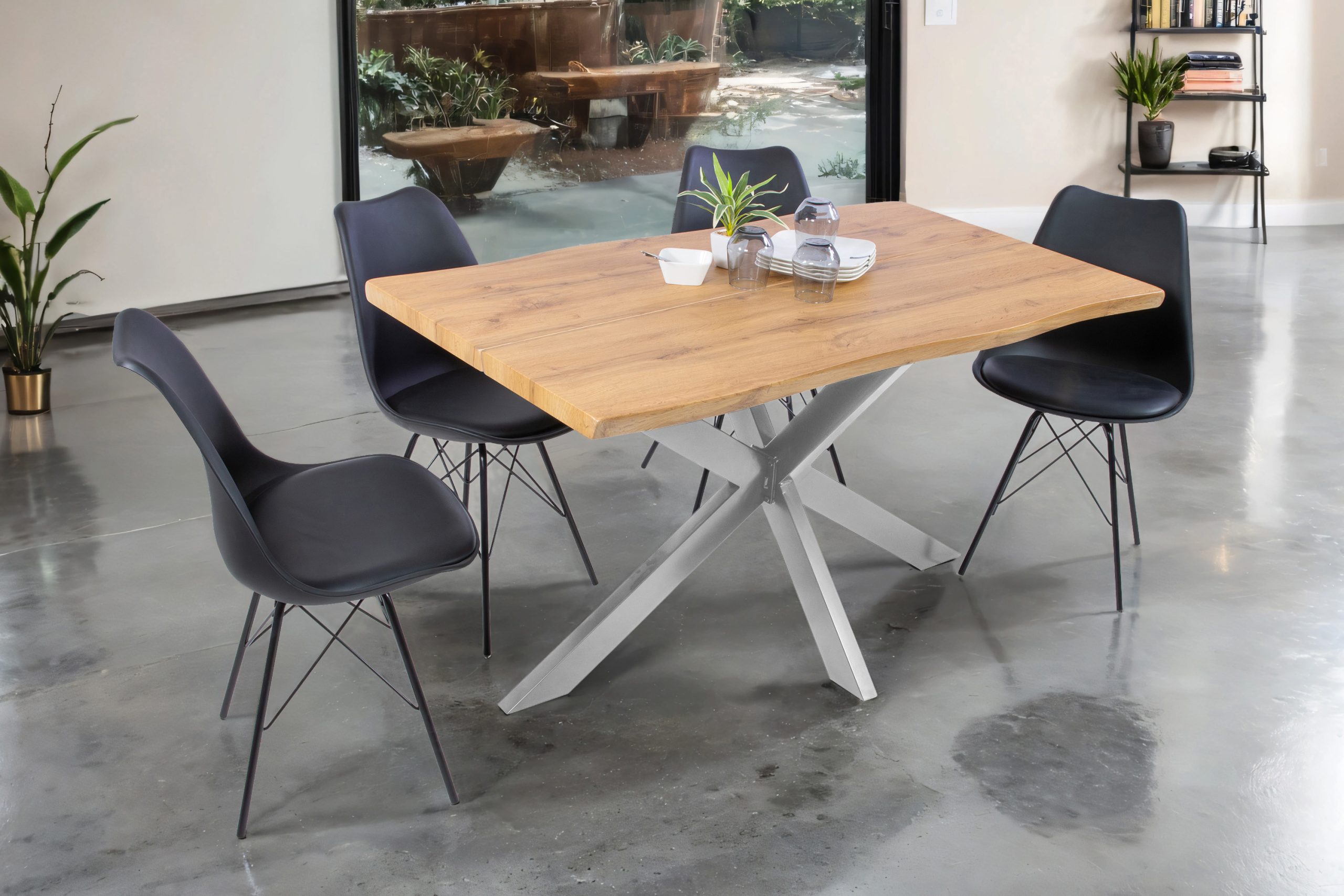 Esstisch Dua | 140 x 80 cm | Wildeiche-Optik | Spider-Gestell Metall silber | 40 mm Tischplatte mit gefräster Baumkante