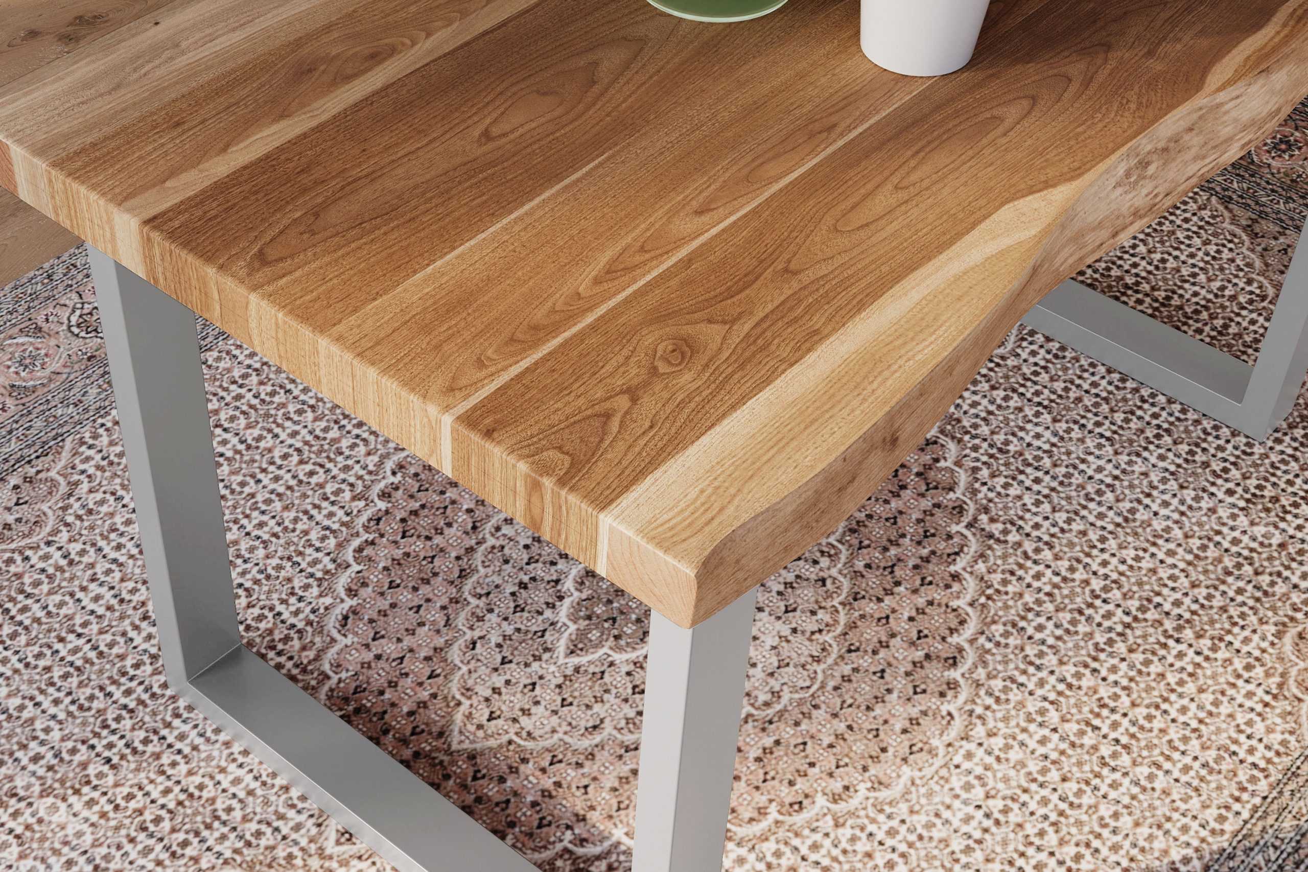 Esszimmertisch Atlas, 160 x 85 cm, massives Akazienholz naturfarben, echte Baumkante, U-Gestell aus Metall Silber