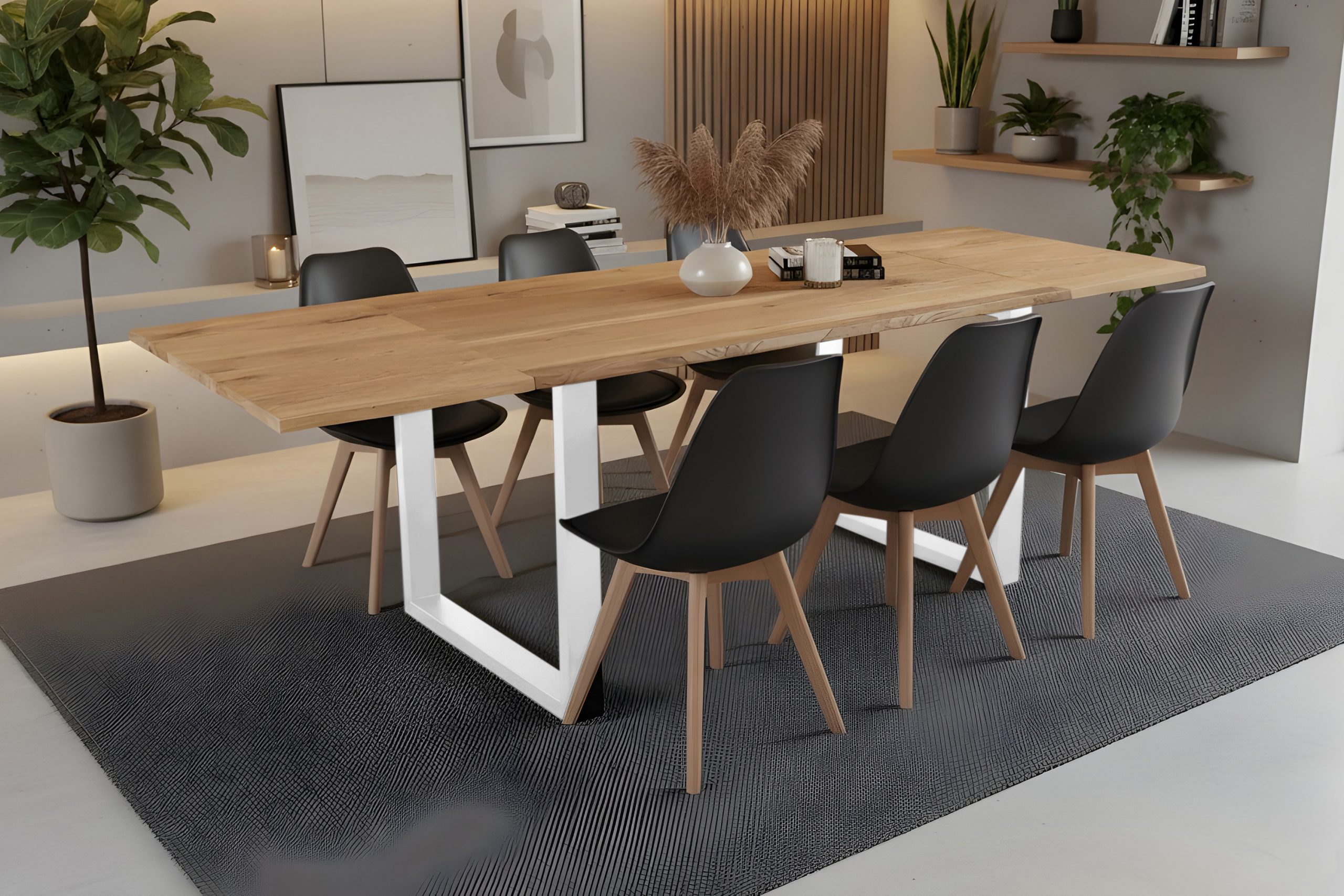 Baumkantentisch Serra | 160–260 x 85 cm | Wildeiche massiv | U-Gestell weiß | Erweiterbar mit Ansteckplatten