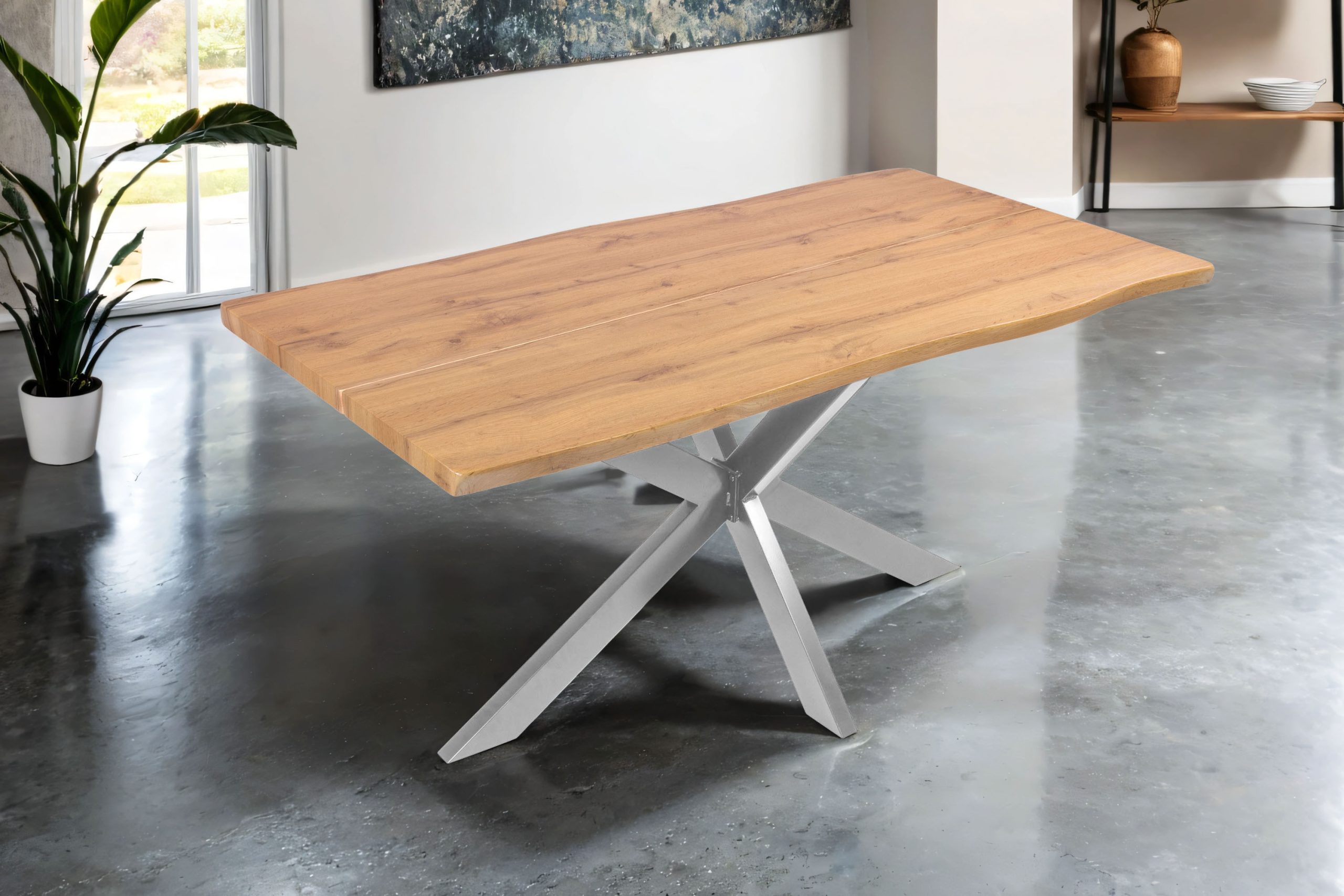 Esstisch Dua | 160 x 85 cm | Wildeiche-Optik | Spider-Gestell Metall silber | 40 mm Tischplatte mit gefräster Baumkante