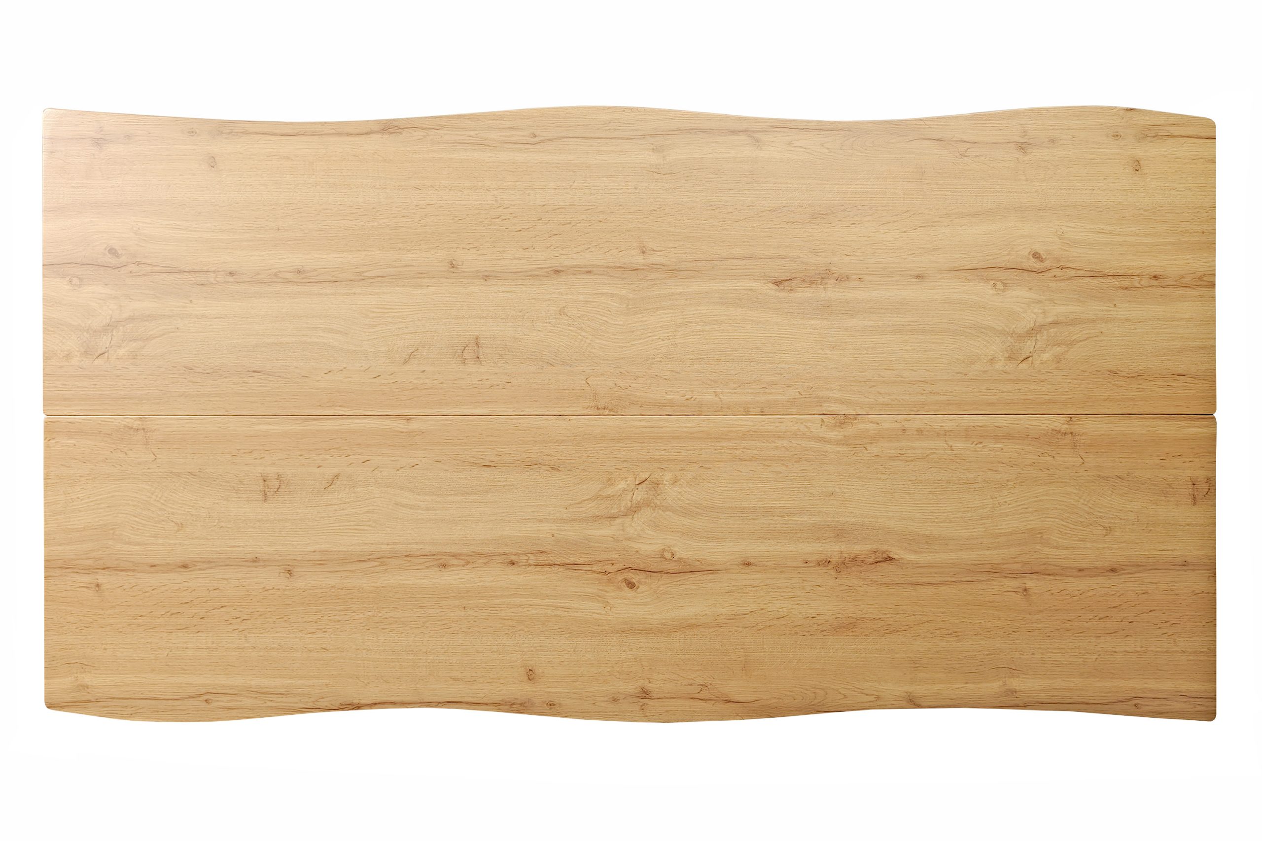 Die Tischplatte des Esstisches Dua ist mittig geteilt und wird aus zwei passgenau gefertigten Elementen zusammengesetzt. So entsteht eine harmonische Gesamtfläche mit durchgängiger Holzstruktur in natürlicher Wildeiche-Optik.