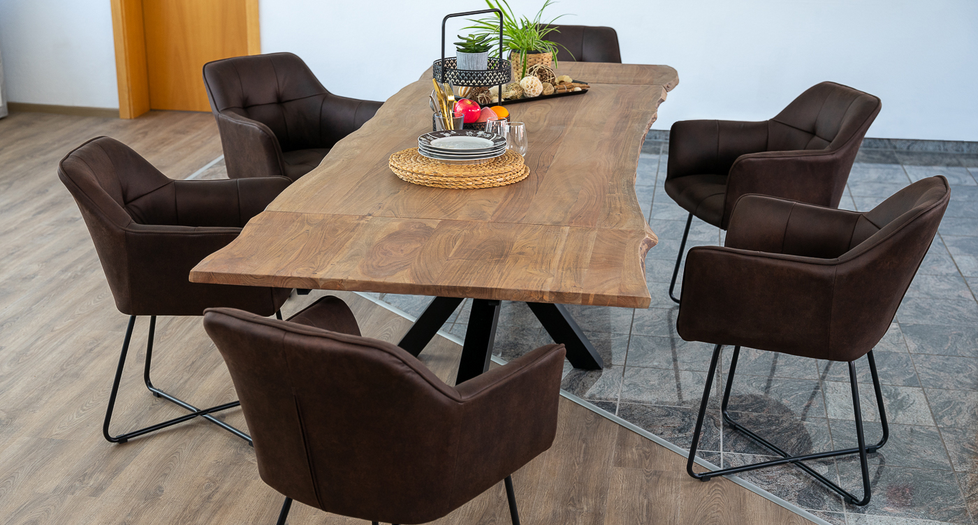 Baumkantentisch Jannik | 180–280 x 90 cm | Akazienholz massiv stonefarben | Erweiterbar mit Ansteckplatten