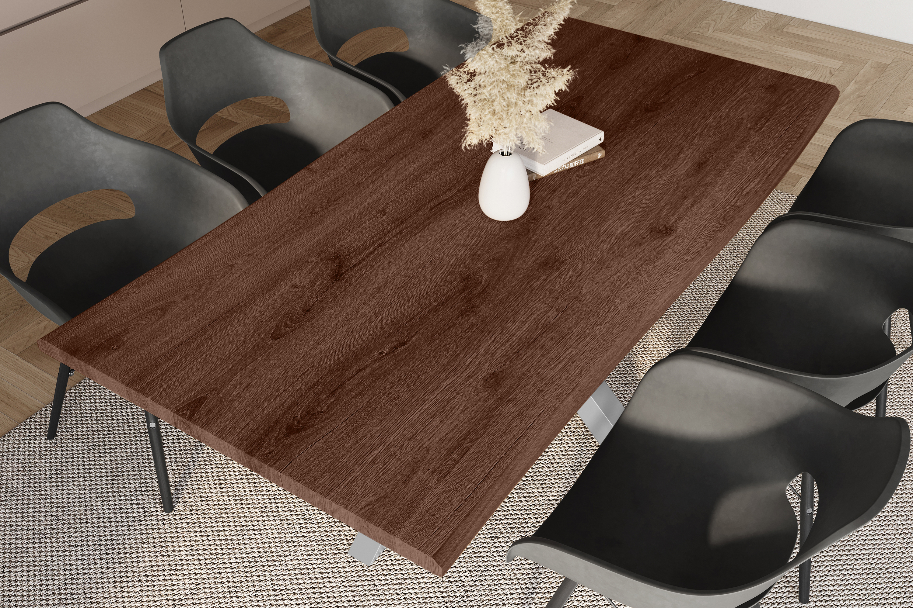 Esstisch Julius | 180 x 90 cm | Holz Nussbaum-Optik | Spider-Gestell Silber | 40 mm Tischplatte mit Baumkante