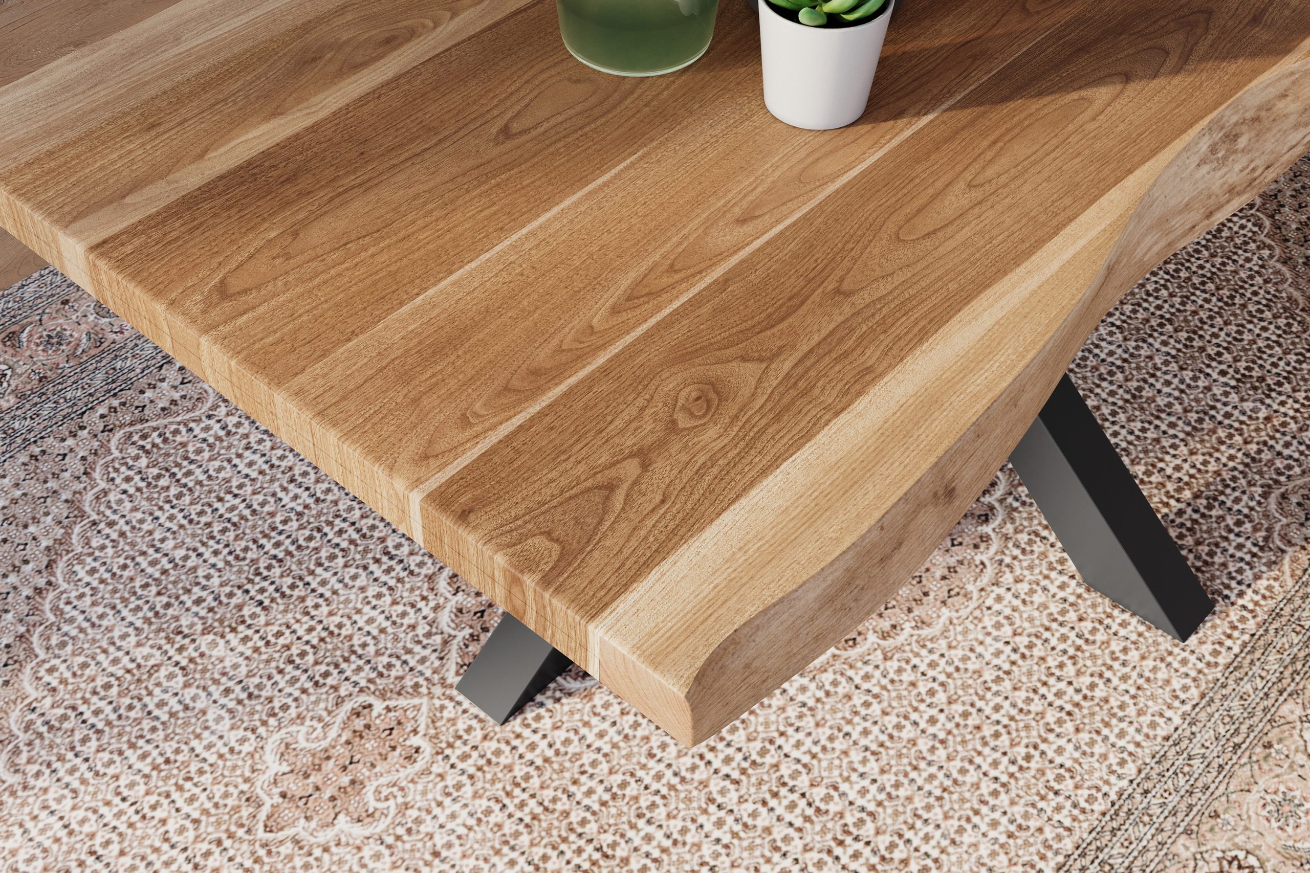 - Der 200 x 100 cm große Tisch besitzt eine 50 mm dicke, aufgedoppelte Platte (25+25 mm) mit natürlicher Baumkante.