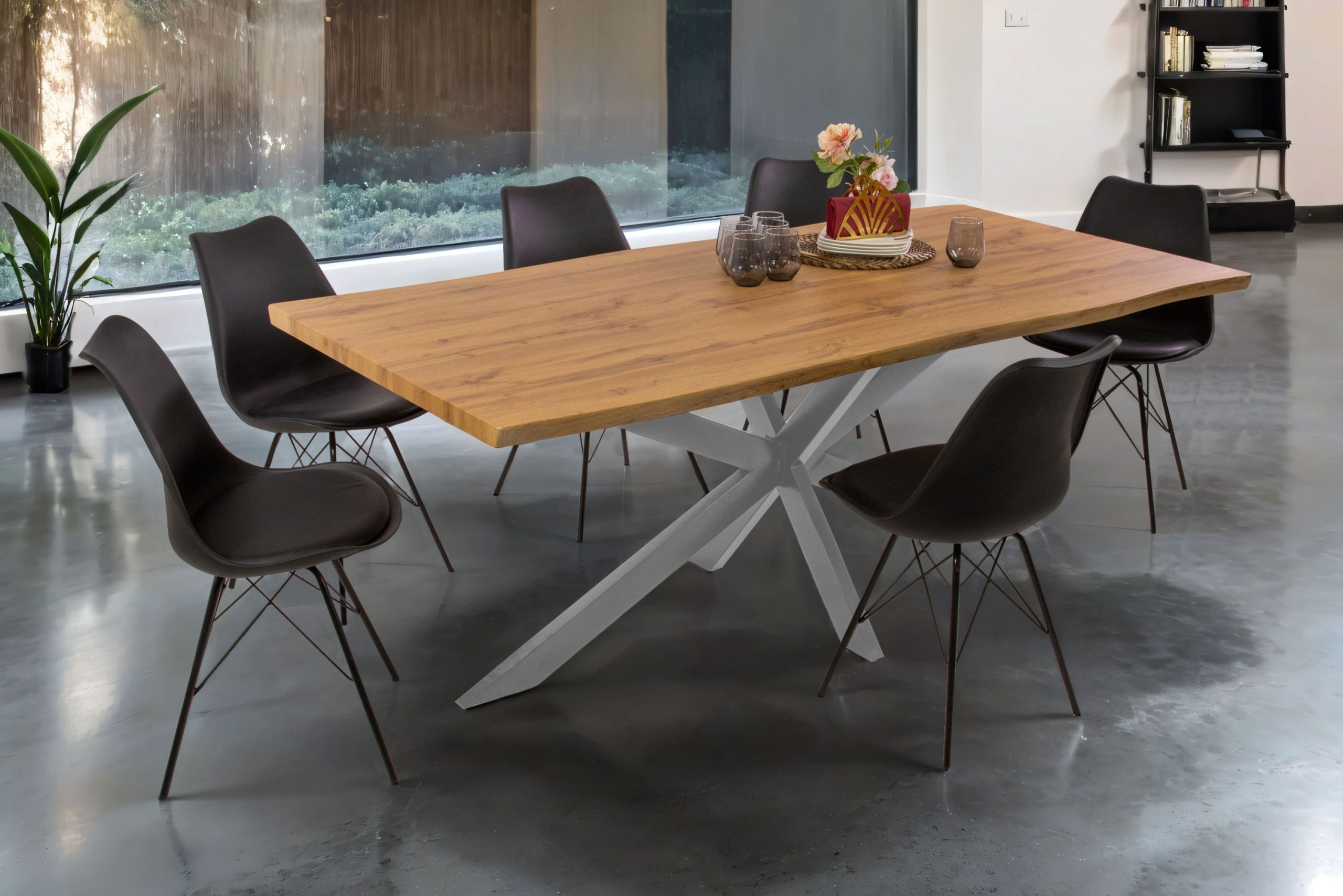 Esstisch Josy | Holz Wildeiche-Optik | Spider-Gestell Metall silber | 200 x 100 cm | 40 mm Tischplatte mit gefräster Baumkante