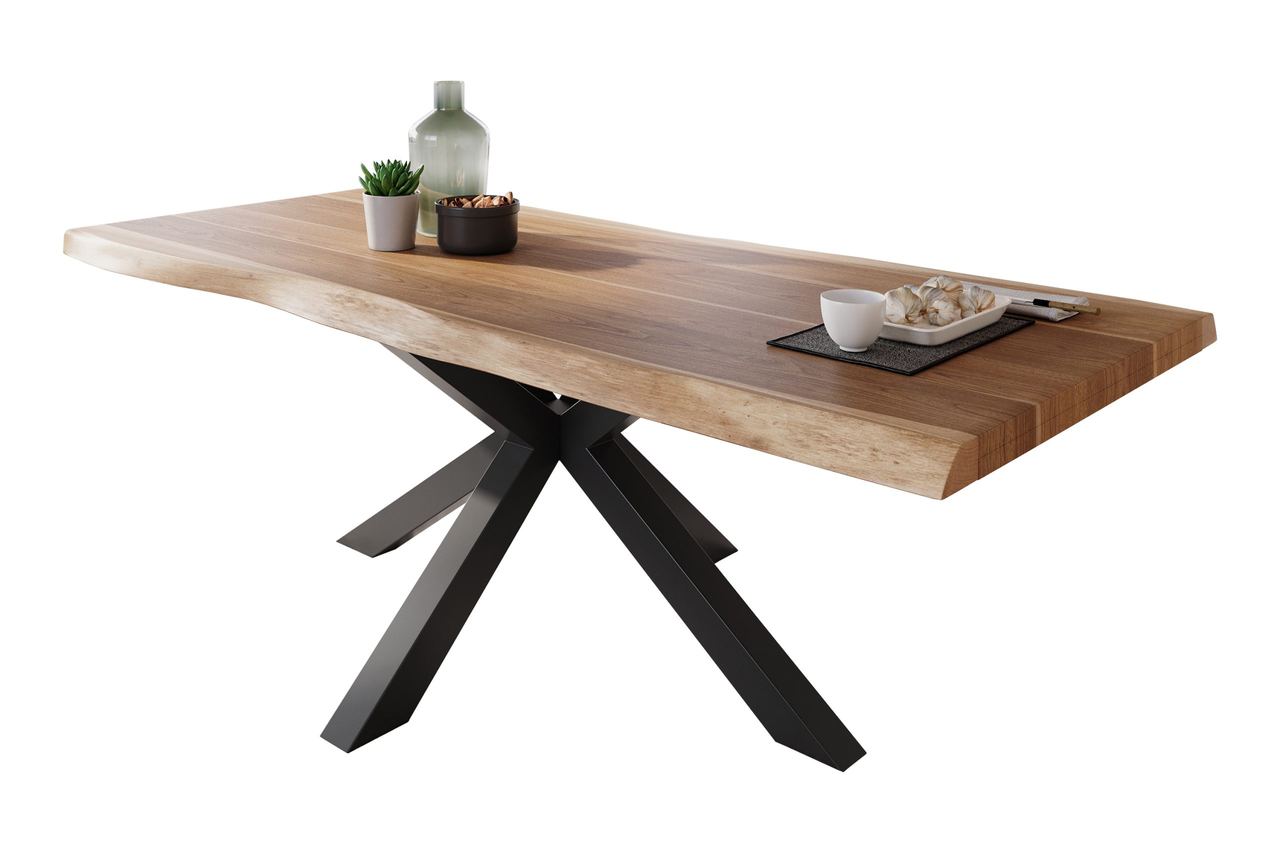 Esszimmertisch Atlas, 220 x 100 cm, massives Akazienholz naturfarben, echte Baumkante, Spider-Gestell aus Metall Schwarz