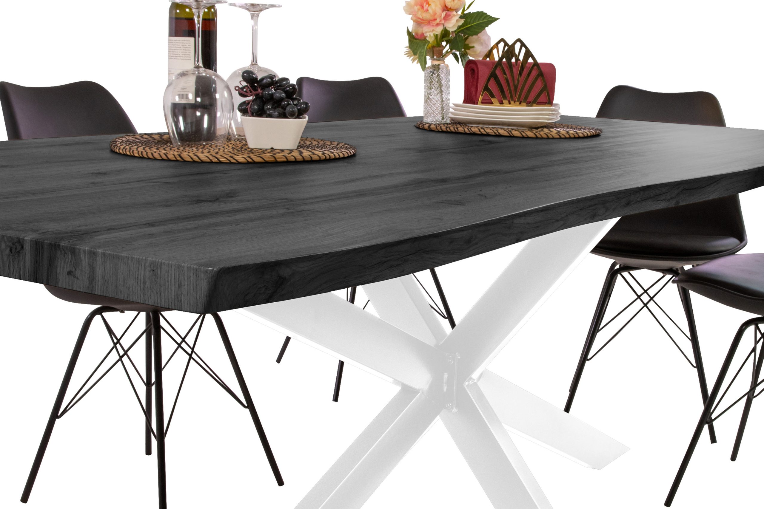 Esstisch Josy | Holz Grau-Optik | Spider-Gestell Metall weiß | 220 x 100 cm | 40 mm Tischplatte mit gefräster Baumkante