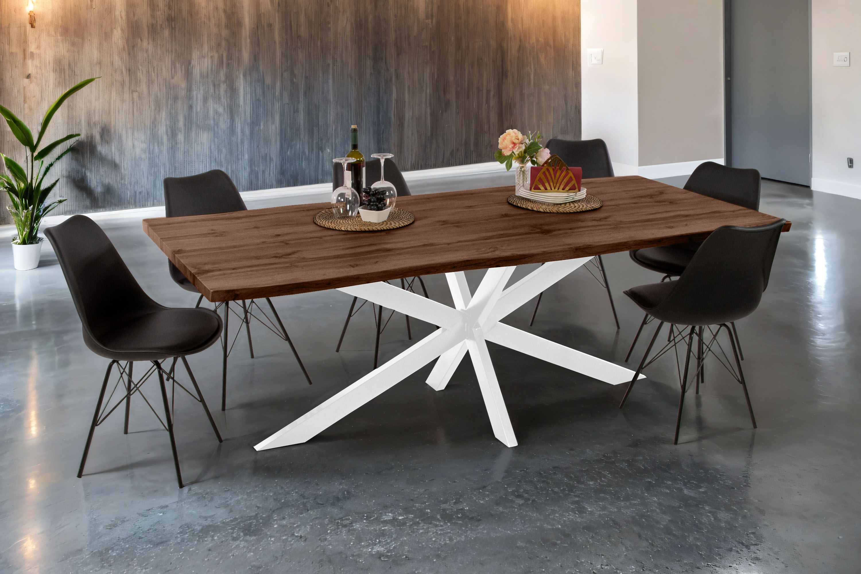 Esstisch Josy | Holz Nussbaum-Optik | Spider-Gestell Metall weiß | 240 x 100 cm | 40 mm Tischplatte mit gefräster Baumkante